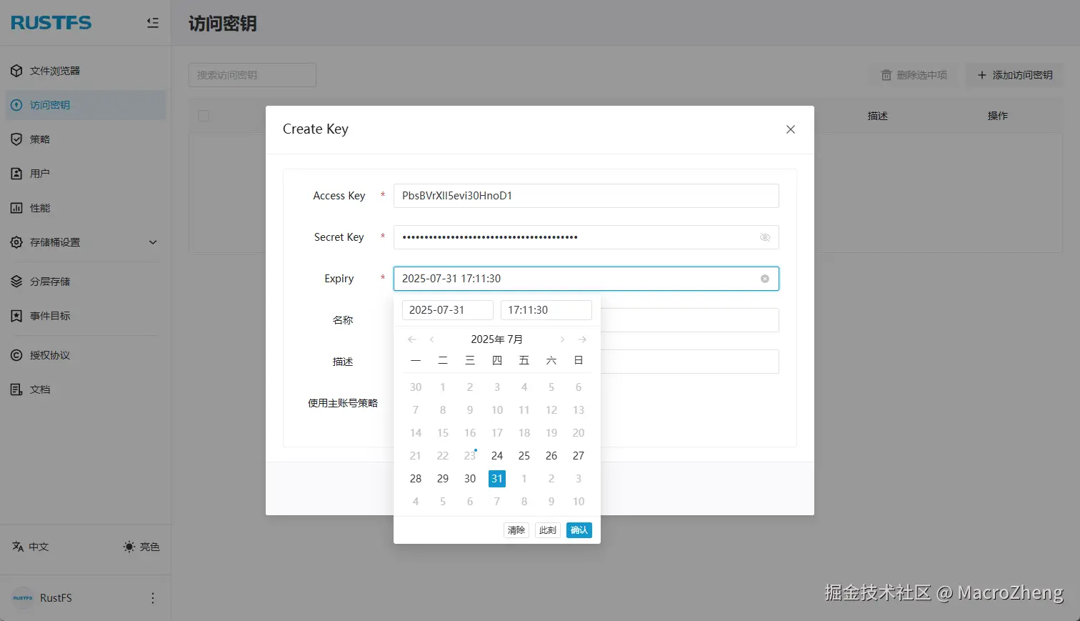 访问密钥功能,可以创建一个有过期时间的密钥,并且可以设置文件访问策略;