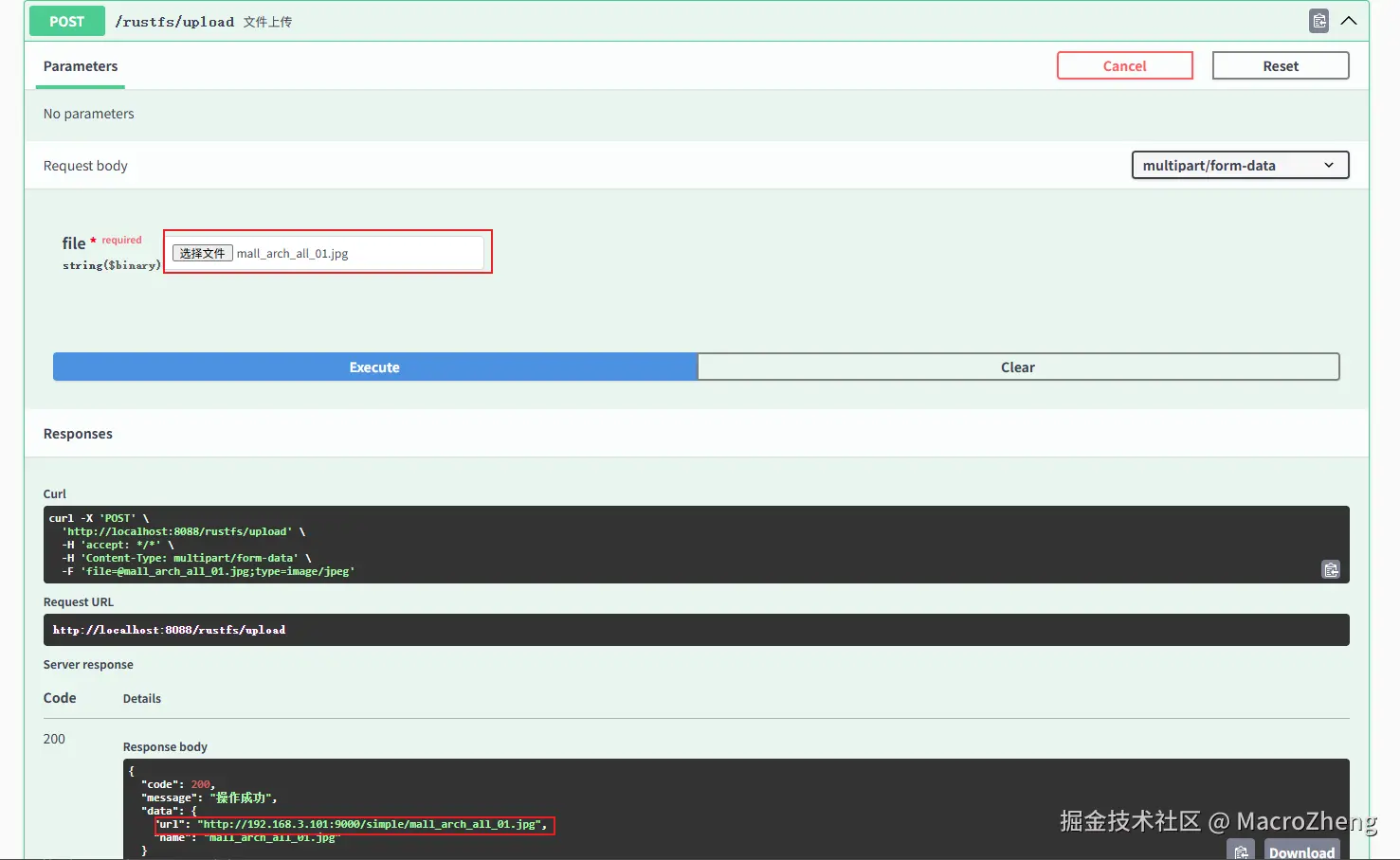 - 由于我们的项目中集成了Swagger,可以直接通过接口文档进行测试,选择好文件后调用