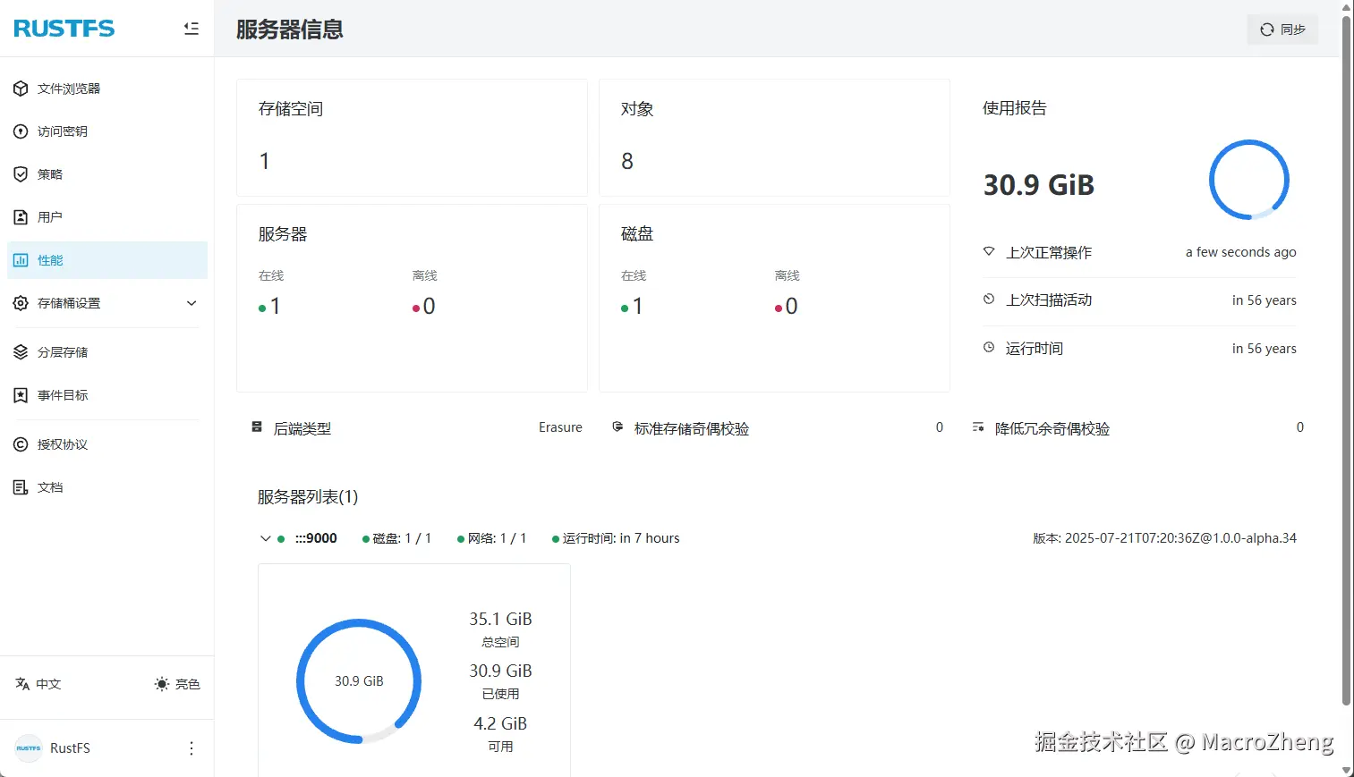 性能功能,可以查看当前RustFS服务器的基本信息。