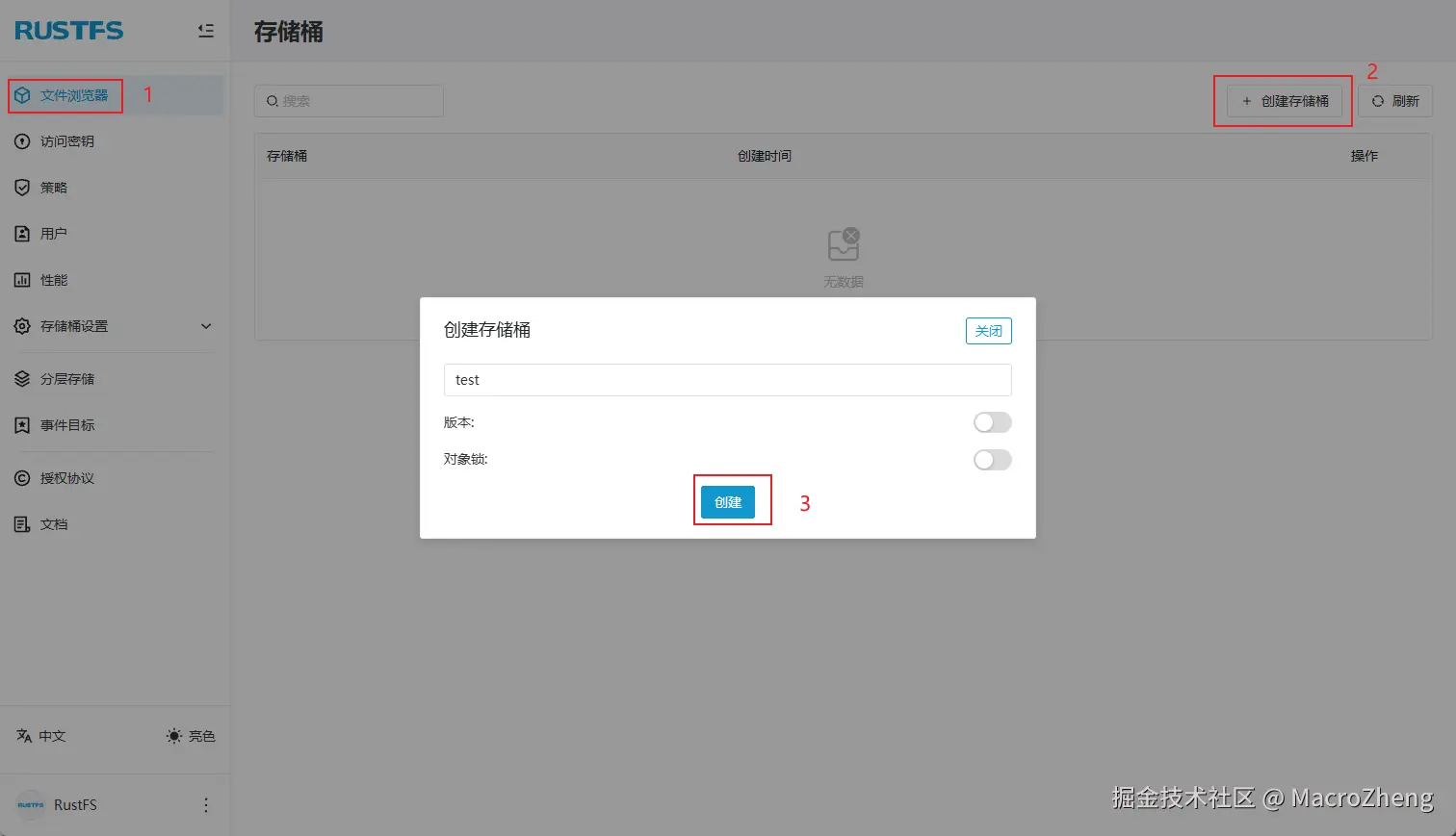 文件浏览器功能,点击右上角的创建存储桶按钮即可创建存储桶;