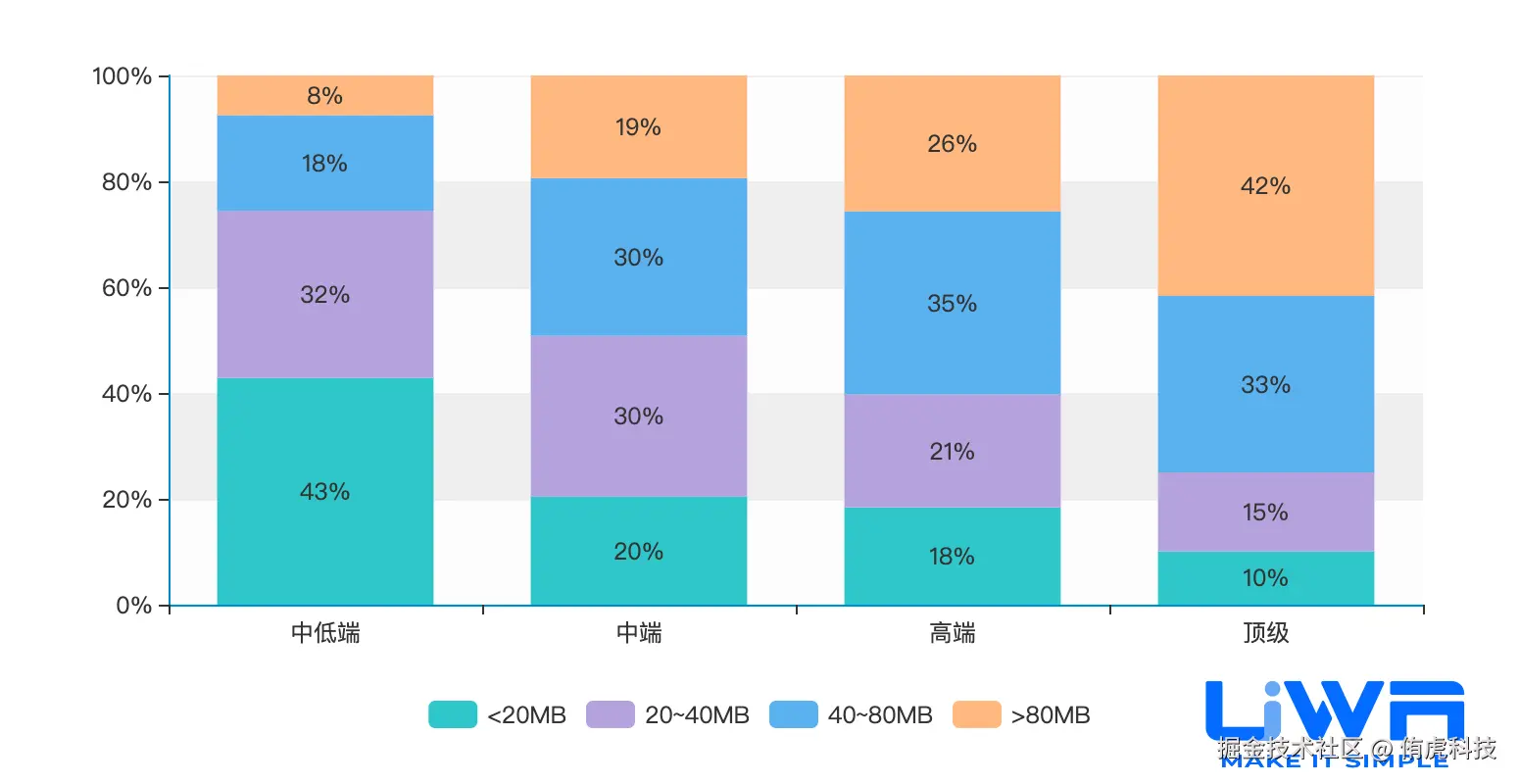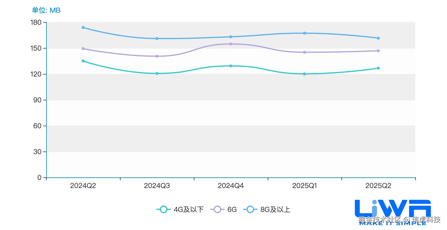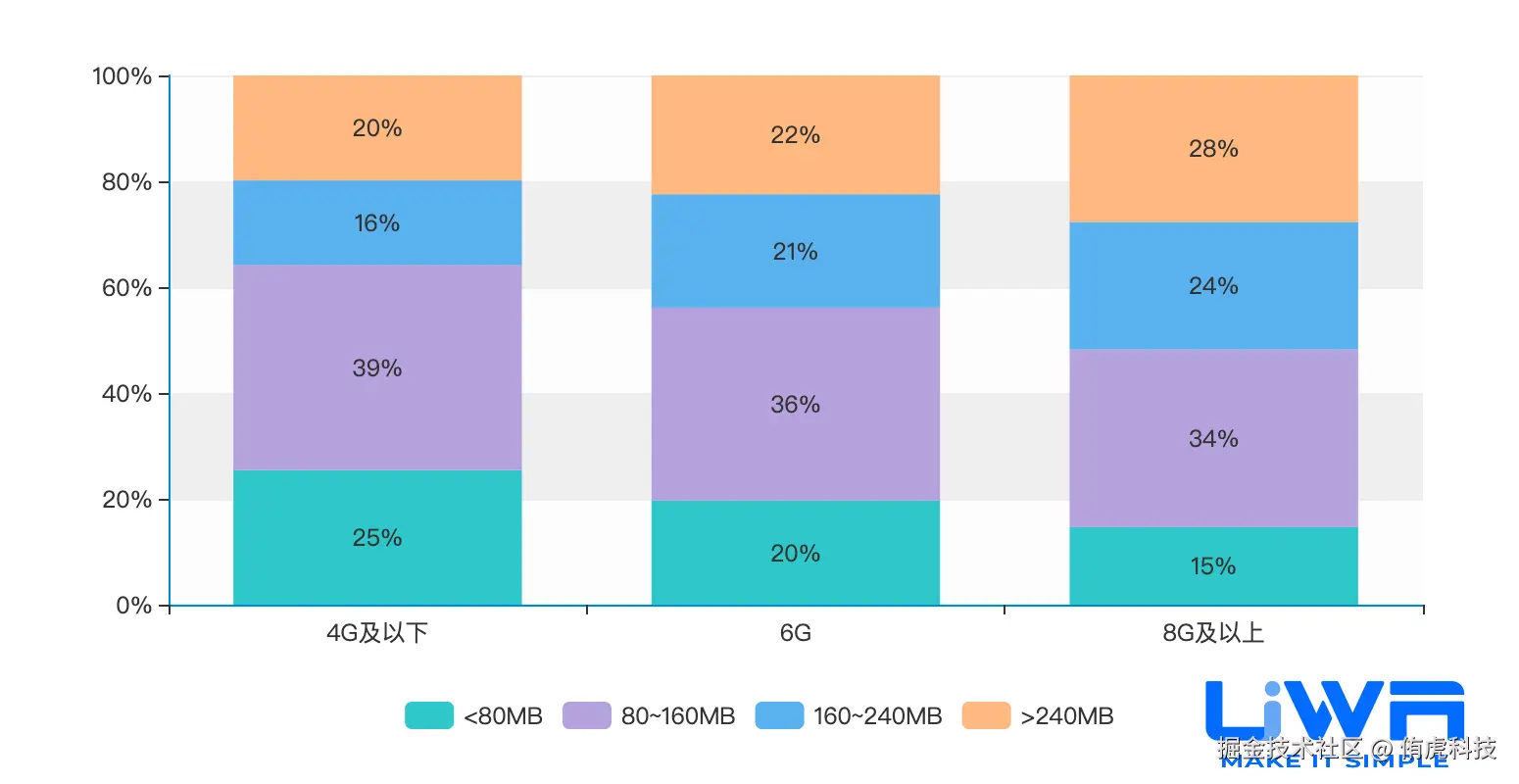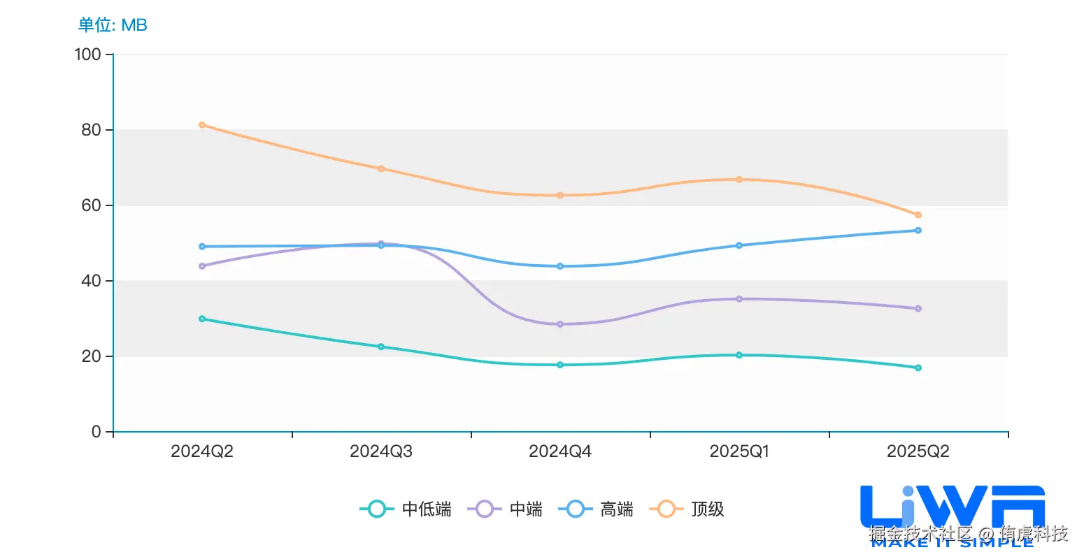 4GB内存以下设备的内存占用(中位值)在1.1GB-1.3GB之间,4GB内存以上设备的内存占用在1.2GB-1.6GB(中位值)之间,且无论是低端、中端还是高端,整体趋势较为平稳。