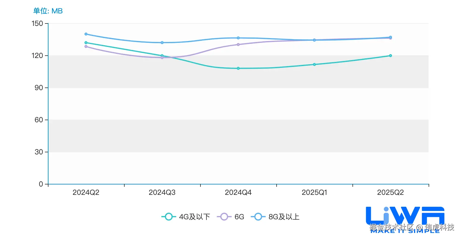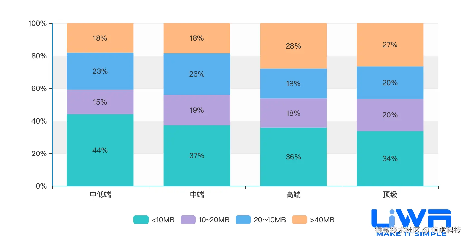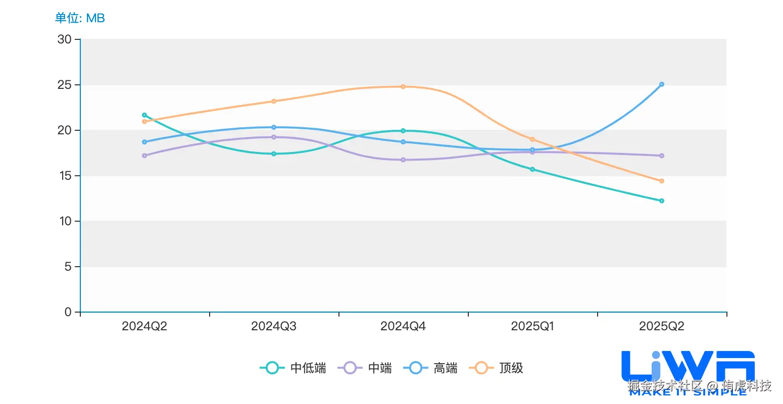 4GB内存以下设备的内存占用(中位值)在1.1GB-1.3GB之间,4GB内存以上设备的内存占用在1.2GB-1.6GB(中位值)之间,且无论是低端、中端还是高端,整体趋势较为平稳。