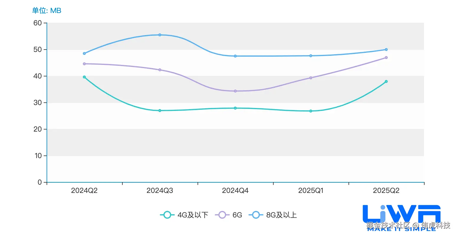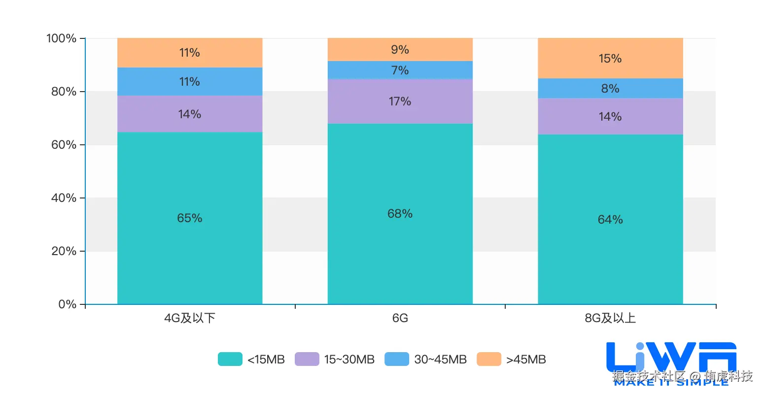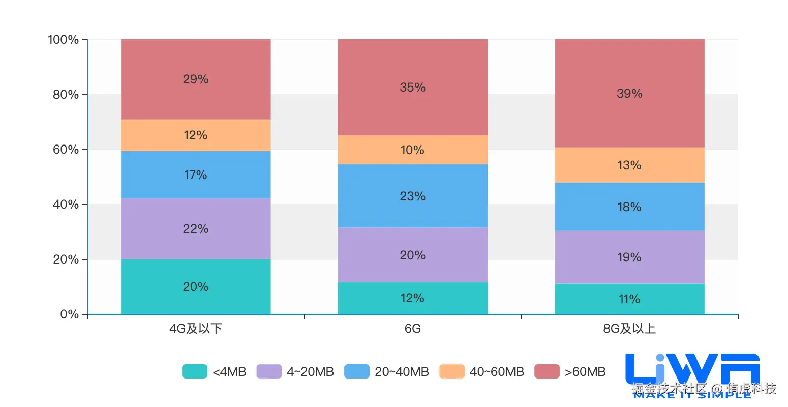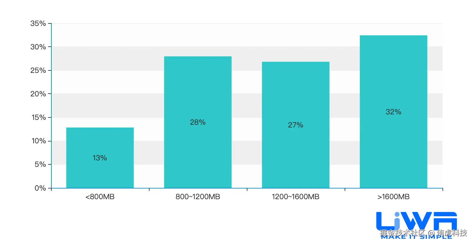 4GB内存以下设备的内存占用(中位值)在1.1GB-1.3GB之间,4GB内存以上设备的内存占用在1.2GB-1.6GB(中位值)之间,且无论是低端、中端还是高端,整体趋势较为平稳。