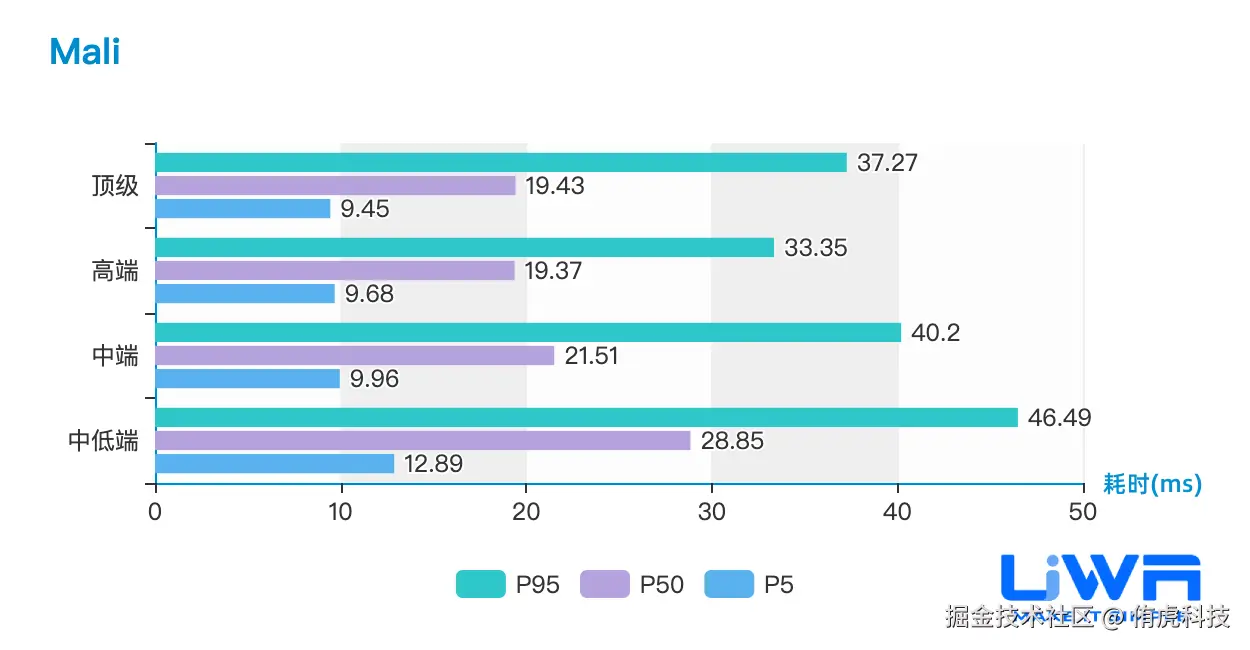 GPU耗时表示GPU处于工作状态的时间,我们在这个方面迭代了大量的计算版本来提升改数值的精准性。虽然由于GPU可以在不同的频率下工作,工作时间并不直接反应工作压力,但该数值仍可以针对不同的芯片来进行较为精准地反馈,下面是Mali芯片和Adreno芯片上该指标的性能趋势。