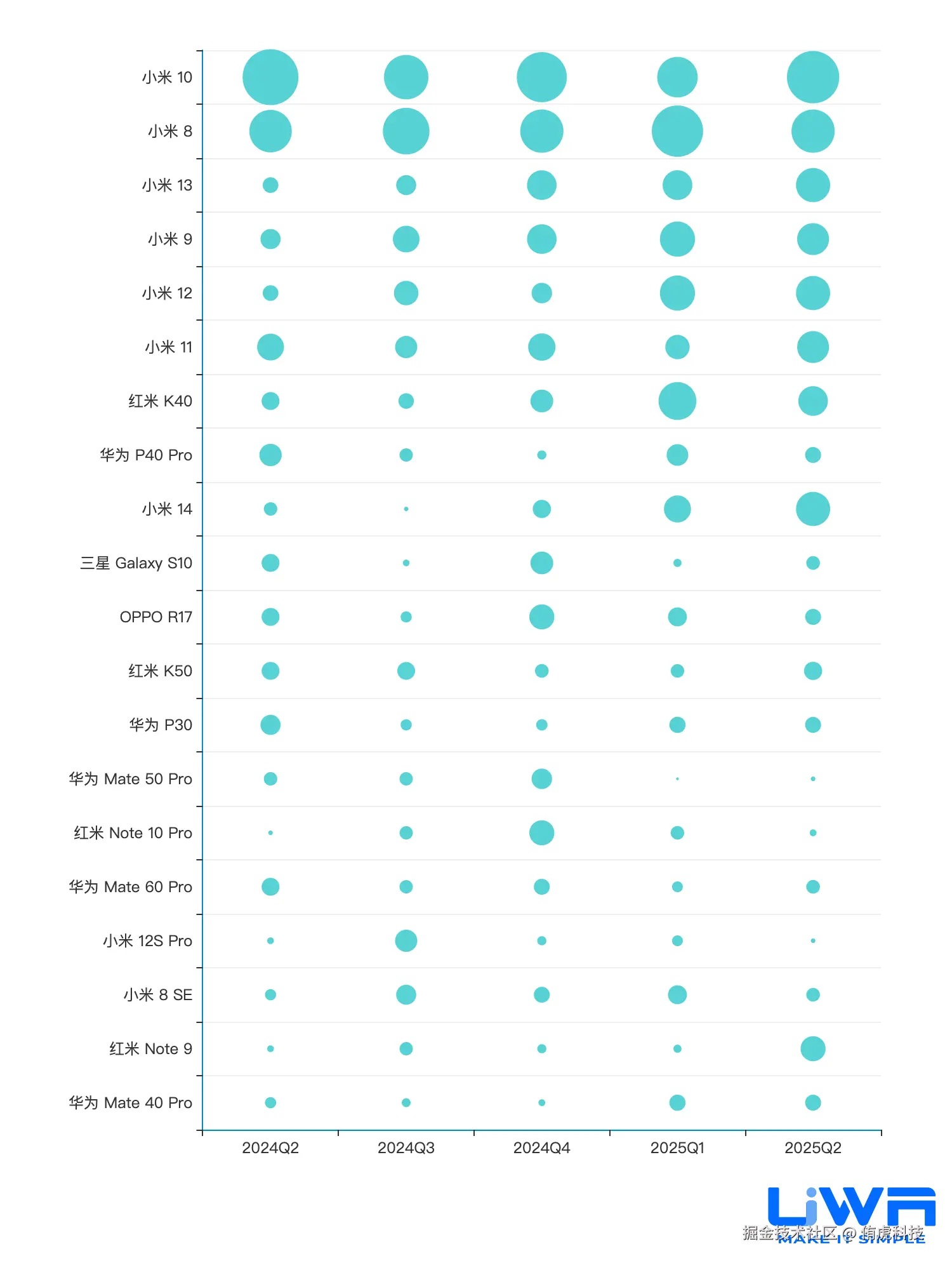 - 小米品牌以绝对性优势在测试机型中拔得头筹,Top 3机型分别为小米 10、小米 8和小米 13;