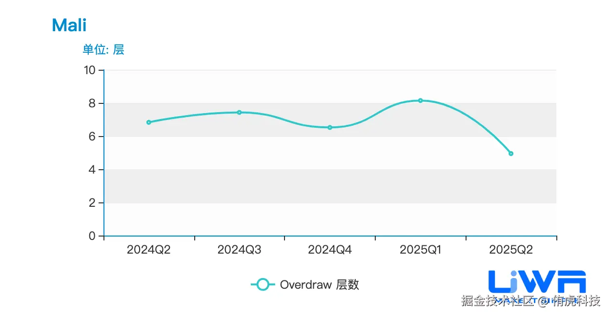 在最近一年的移动游戏测试中,无论是Mali芯片还是Adreno芯片,其Overdraw层数基本上都维持在4~8层左右,如下图所示。