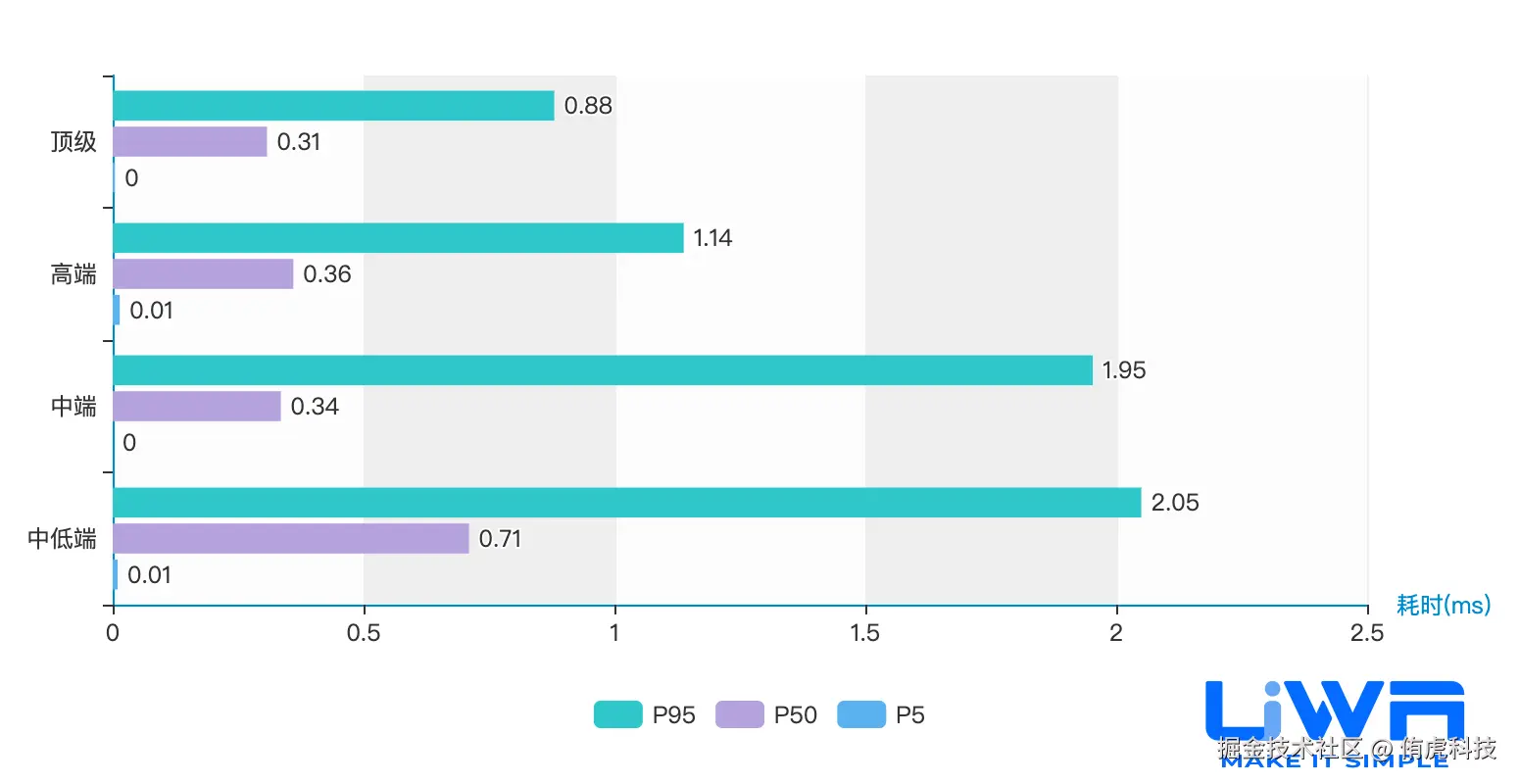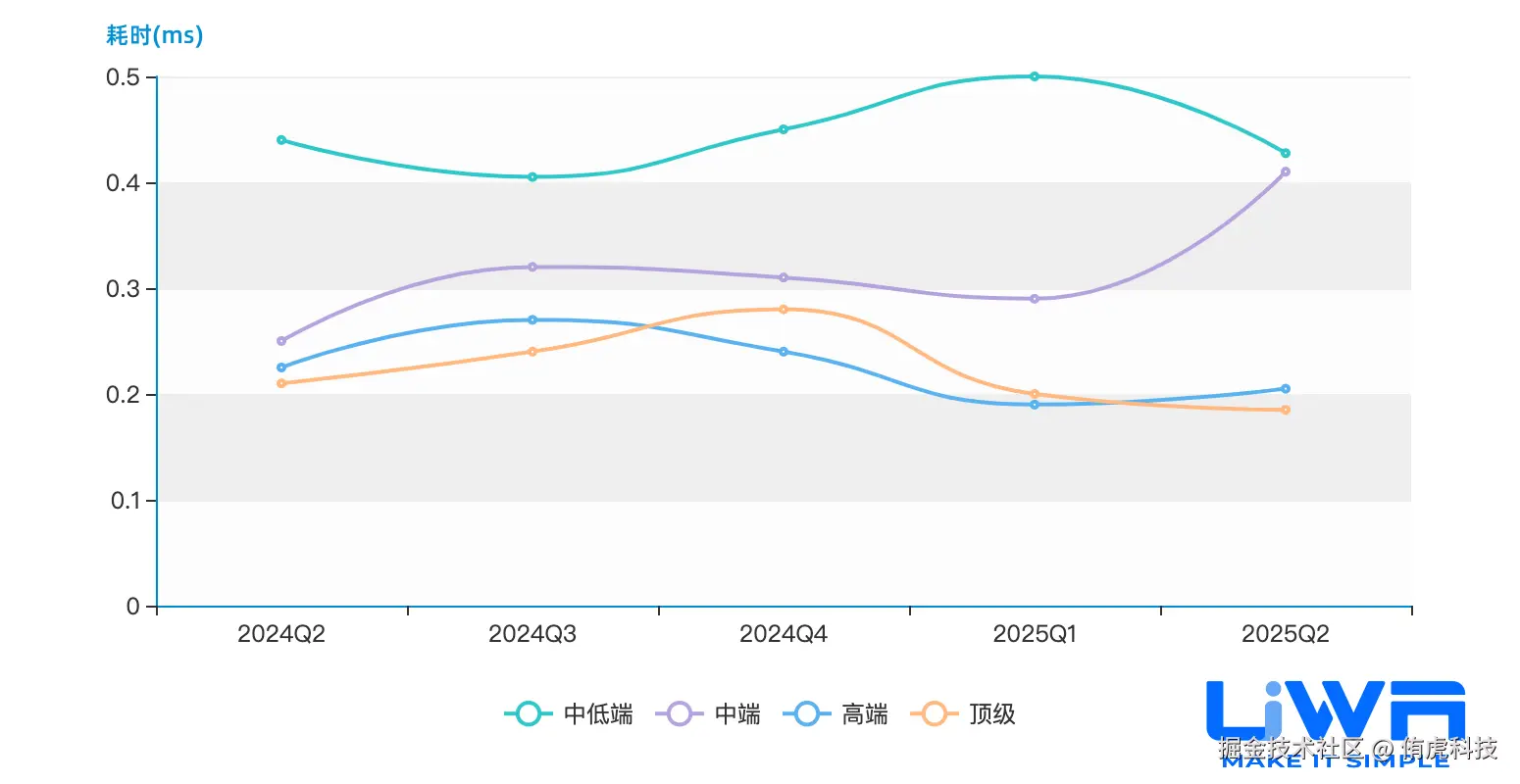 除了中低端设备,其他档次设备的动画性能的趋势表现都较为平稳,说明大家对于动画模块的使用较为合理的。除了中低端设备以外,动画模块的性能耗时在2025年Q1均有所上涨。