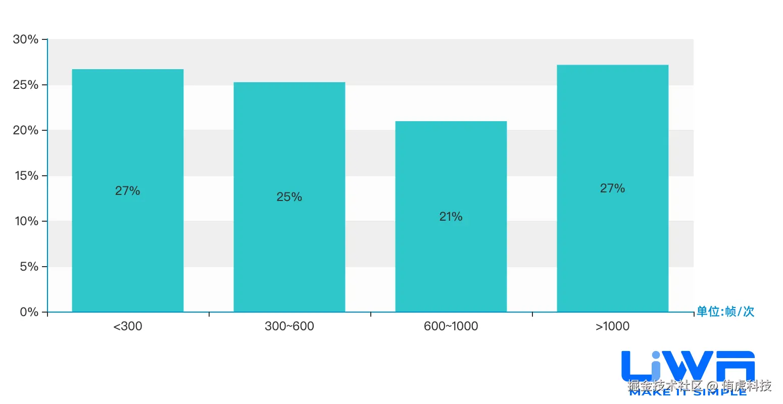 仅有27%的项目将GC调用频率控制在1000帧/次以上;52%左右的项目小于600帧/次,说明GC问题依然值得关注。