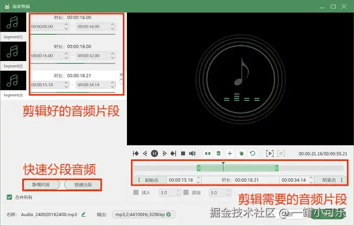步骤3:录制完成后,在 “高级剪辑” 界面进行必要的编辑,如快速分段音频、剪辑需要的音频片段等,还可以在设置中调整音频的输出格式、比特率等。