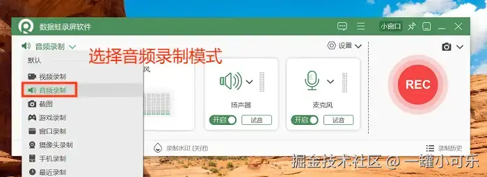 步骤1:打开数据 蛙录屏软件后,在主页面的左上角,选择 “音频录制” 模式。