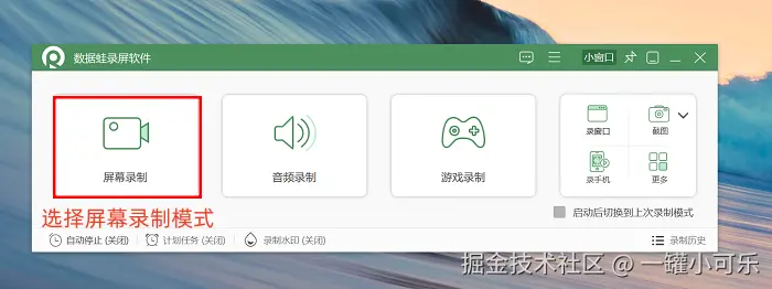 步骤1:电脑怎么录制视频?你先下载安装好软件,打开之后,主界面简洁明了,一看就懂。选择好你要用的录制模式,比如屏幕录制。