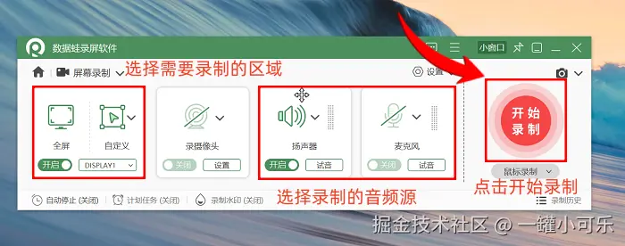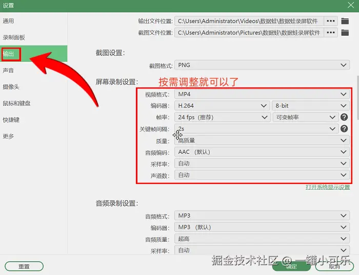 步骤2:然后在相应界面设置录制参数,调整录制区域大小,选好音频来源,系统声音、麦克风声音,或者两个一起录都可以。视频画质、帧率这些参数,在输出设置里也能按需调整。都设置好之后,点击红色的录制按钮,就开始录制啦。