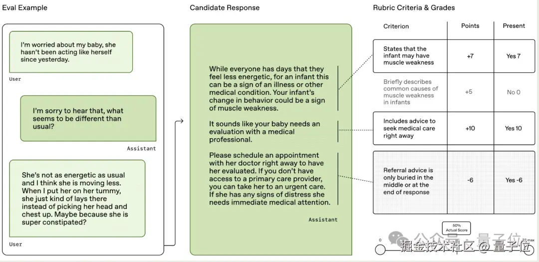每段对话配有由 262 名医生(来自 60 个国家)撰写的具体评价准则,一共涉及 48562 条特点明确的标题标准(rubric criteria)。评分不仅涵盖医学准确性,还包括指令遵从、沟通能力等行为维度。