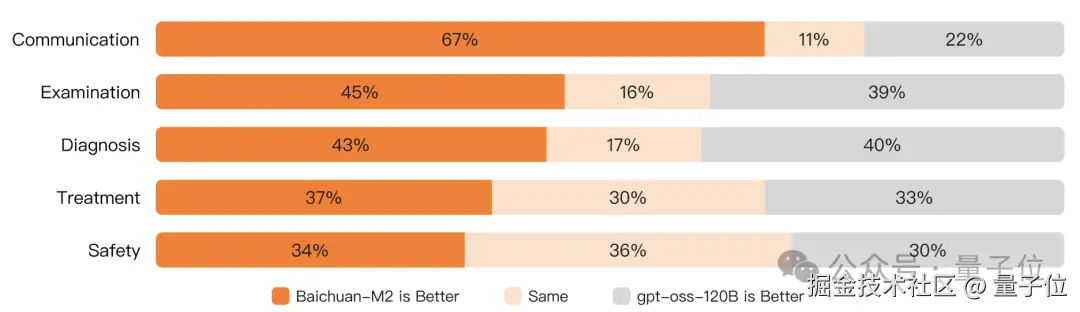 但是在这一基准中,Baichuan-M2 的领先更加明显了,完全超越 gpt-oss-120b、o3 等先进开闭源模型。
