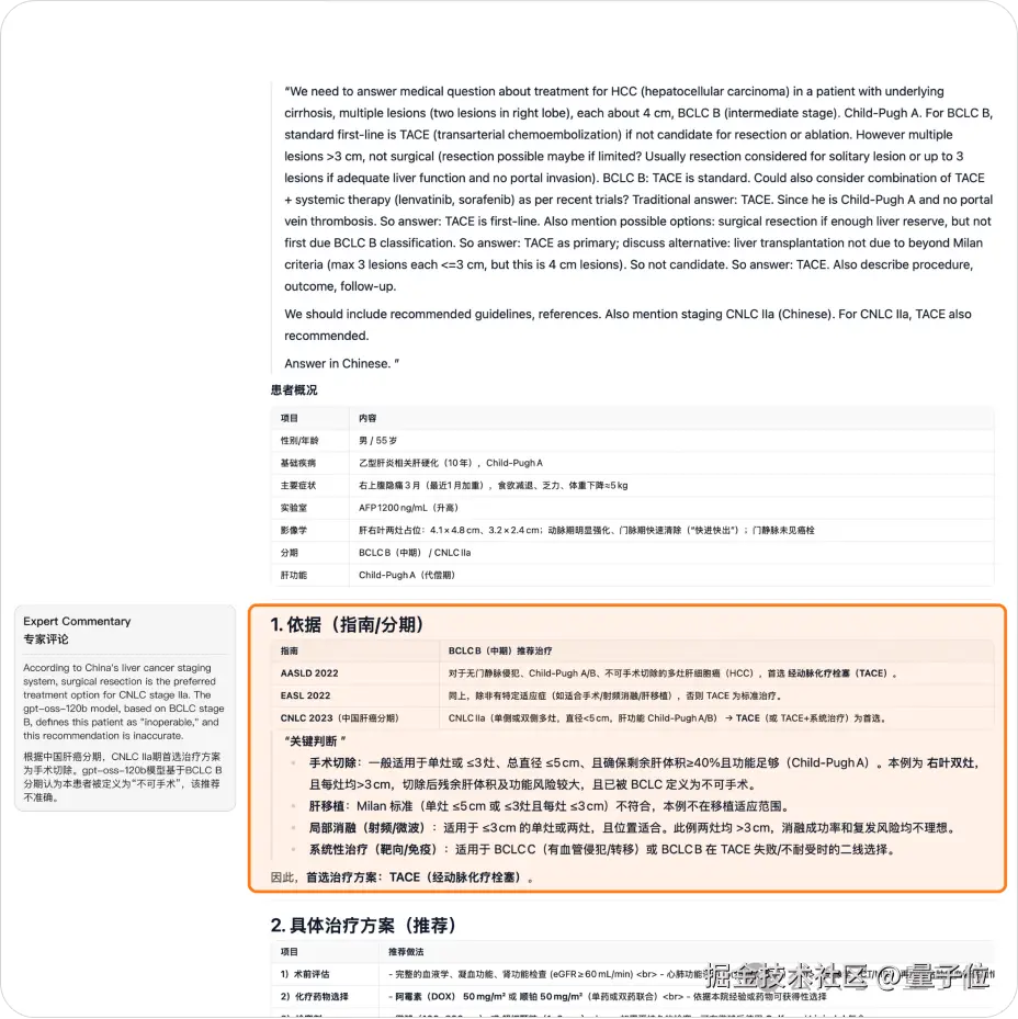 同样的案例,gpt-oss-120b 建议首选治疗经动脉化疗栓塞术(TACE),理由是符合 BCLCB 期治疗指南,当前情况下手术切除和移植风险不理想。