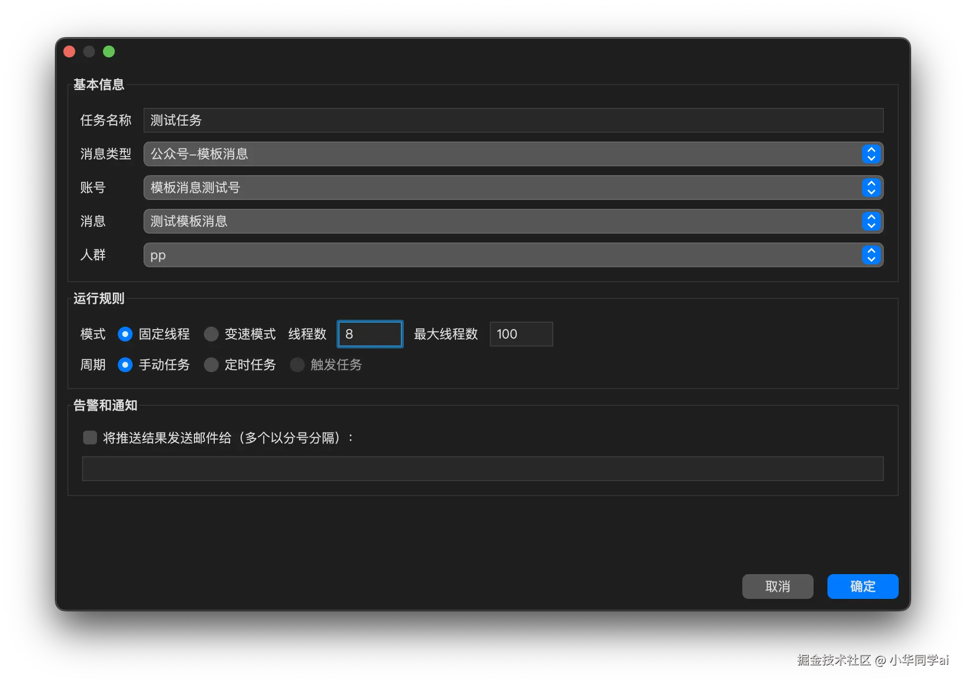 - 定时任务 + 失败重试:设置定时批次发送,自动管理失败任务,保证信息送达。