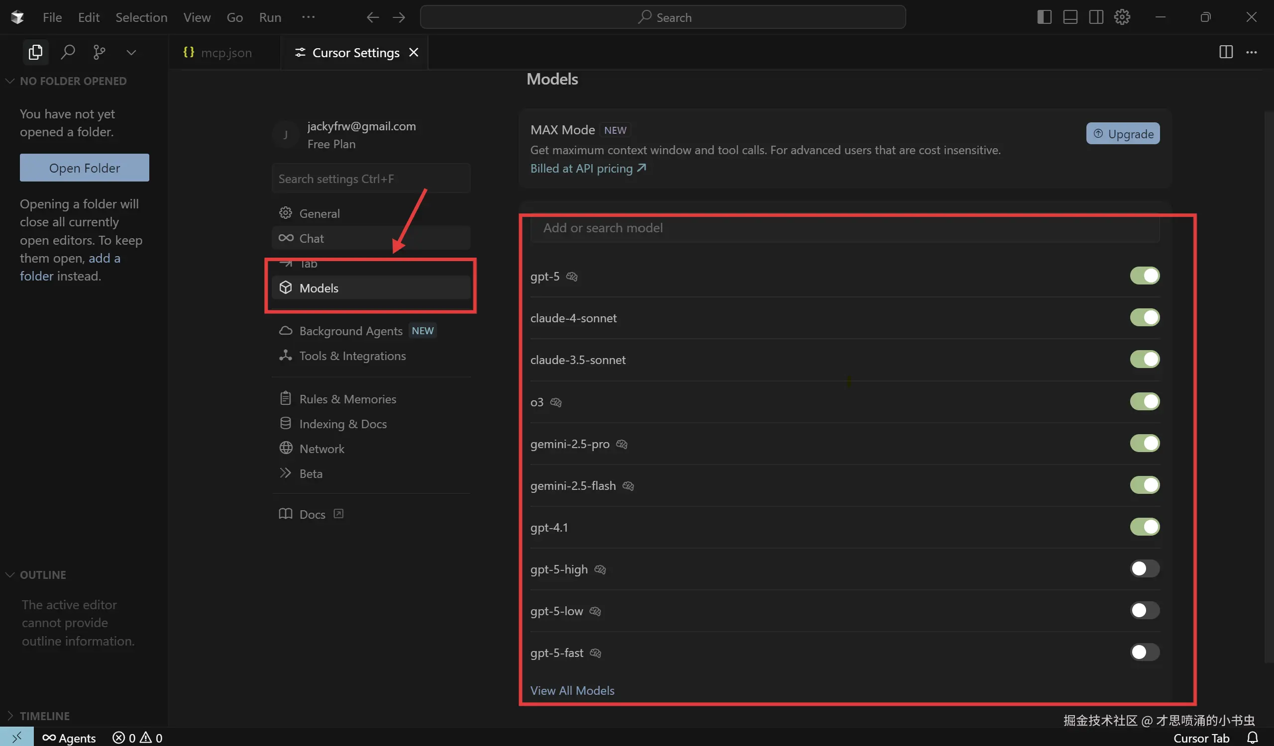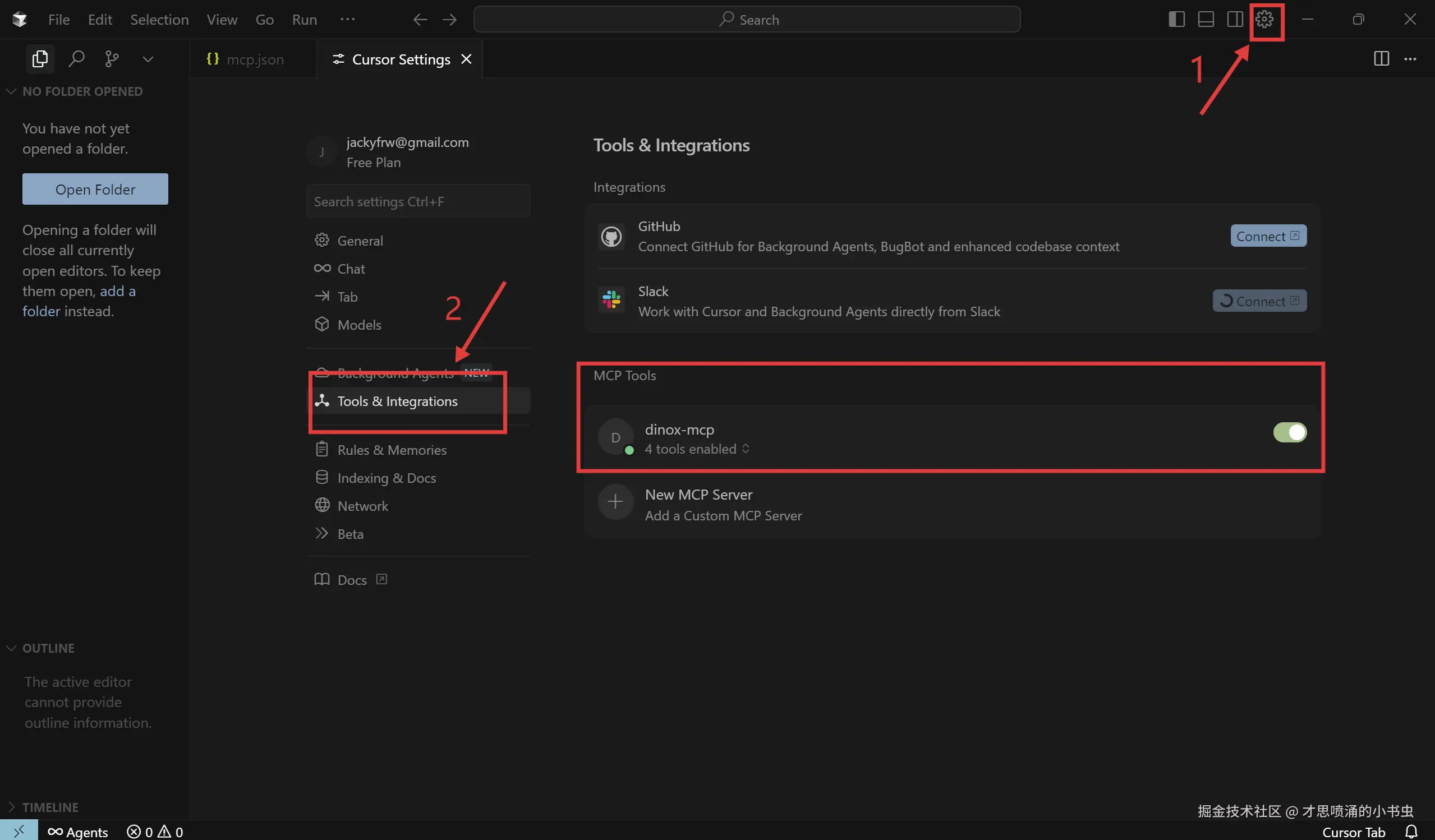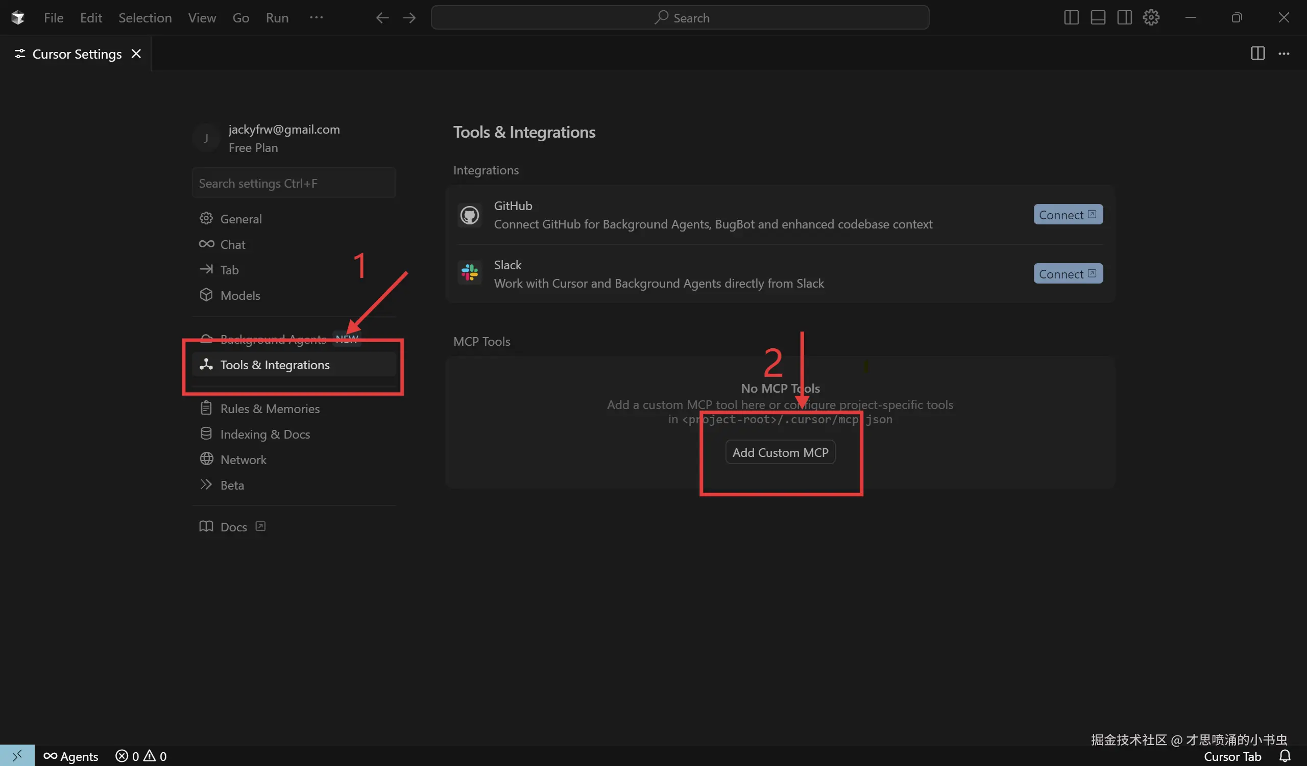 (1)进入 Cursor IDE 页面,点击左侧的 “Tools & Integrations” 按钮,进入 MCP 设置界面。