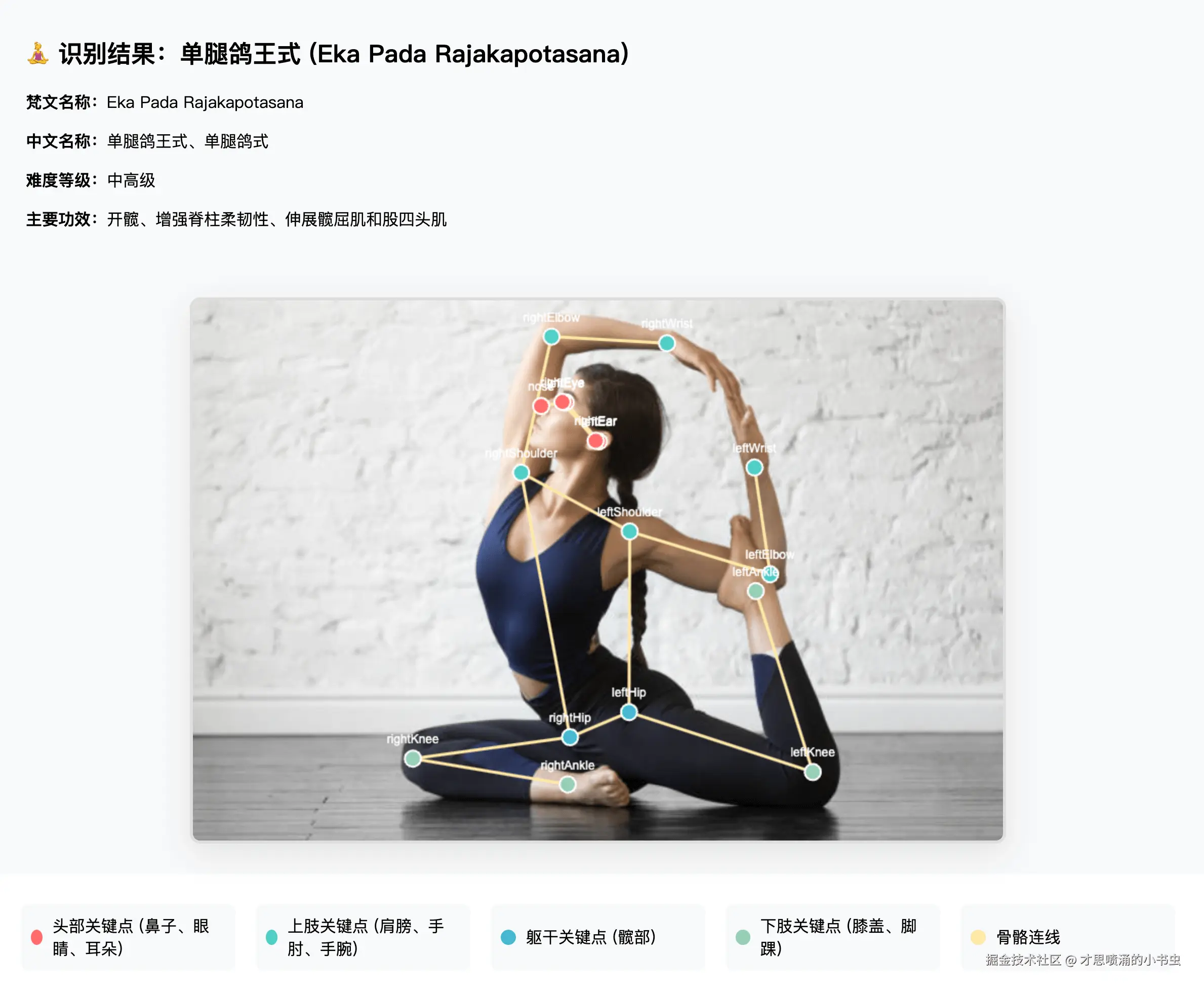 通过对目标对象(人物、动物等)进行关键点检测,结合大语言模型分析出目标对象的姿态含义,比如瑜伽姿势分析。