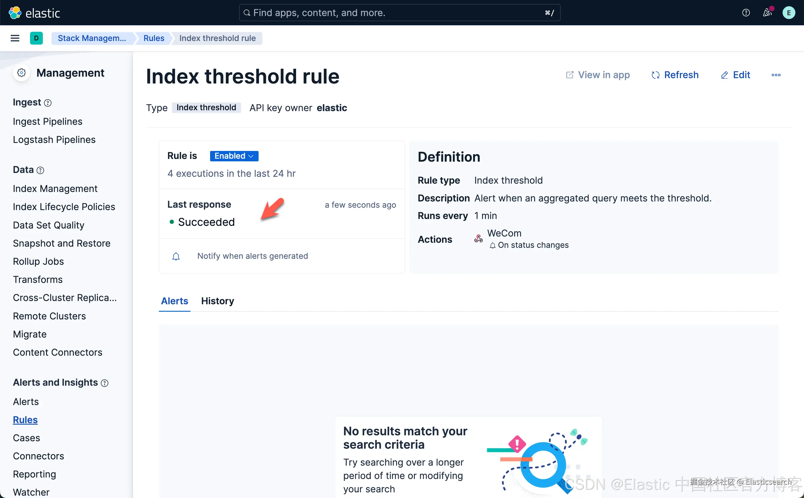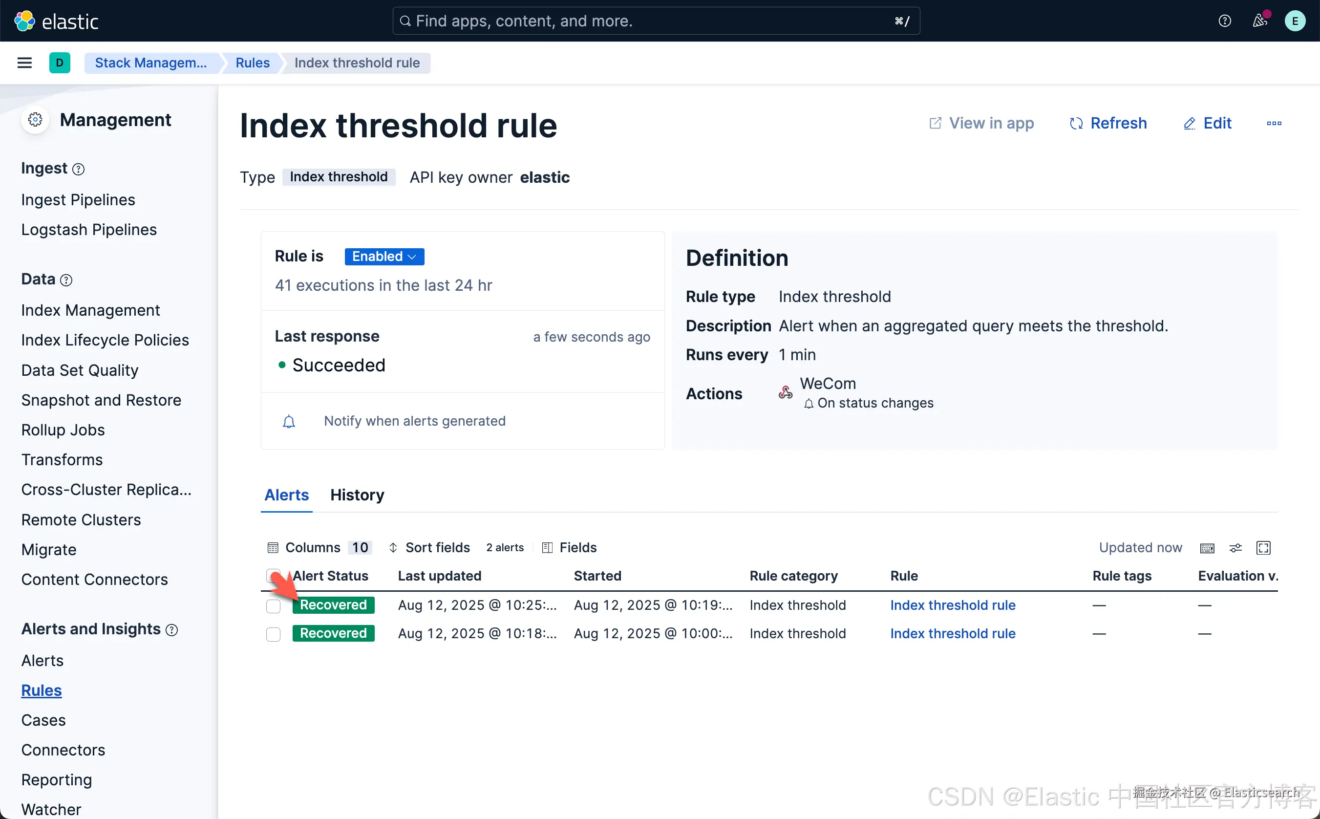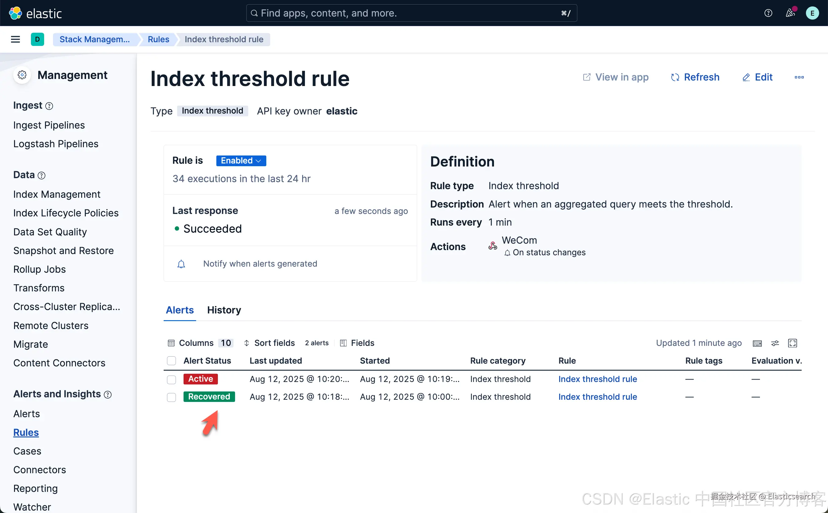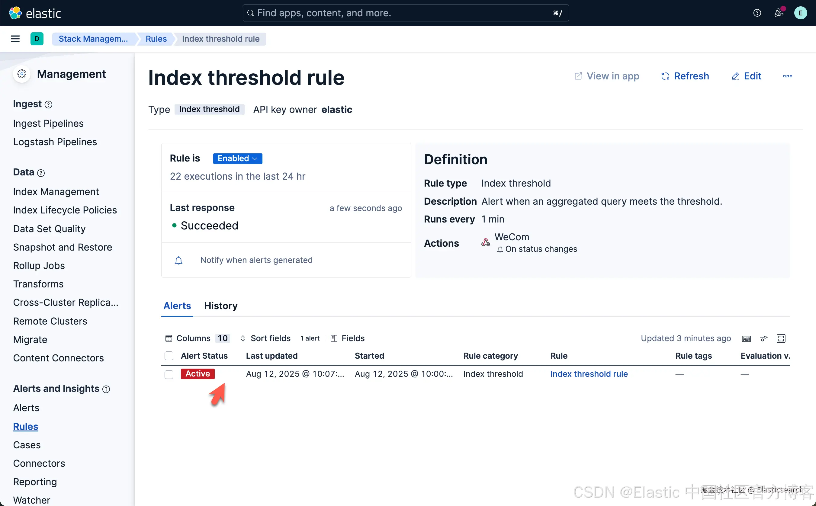 从上面显示中,我们可以看到已经创建了一个叫做 Index threshold rule 的规则。