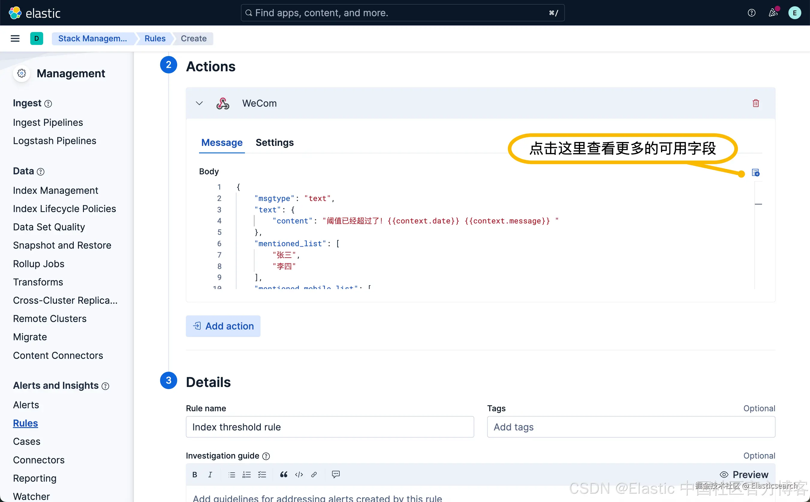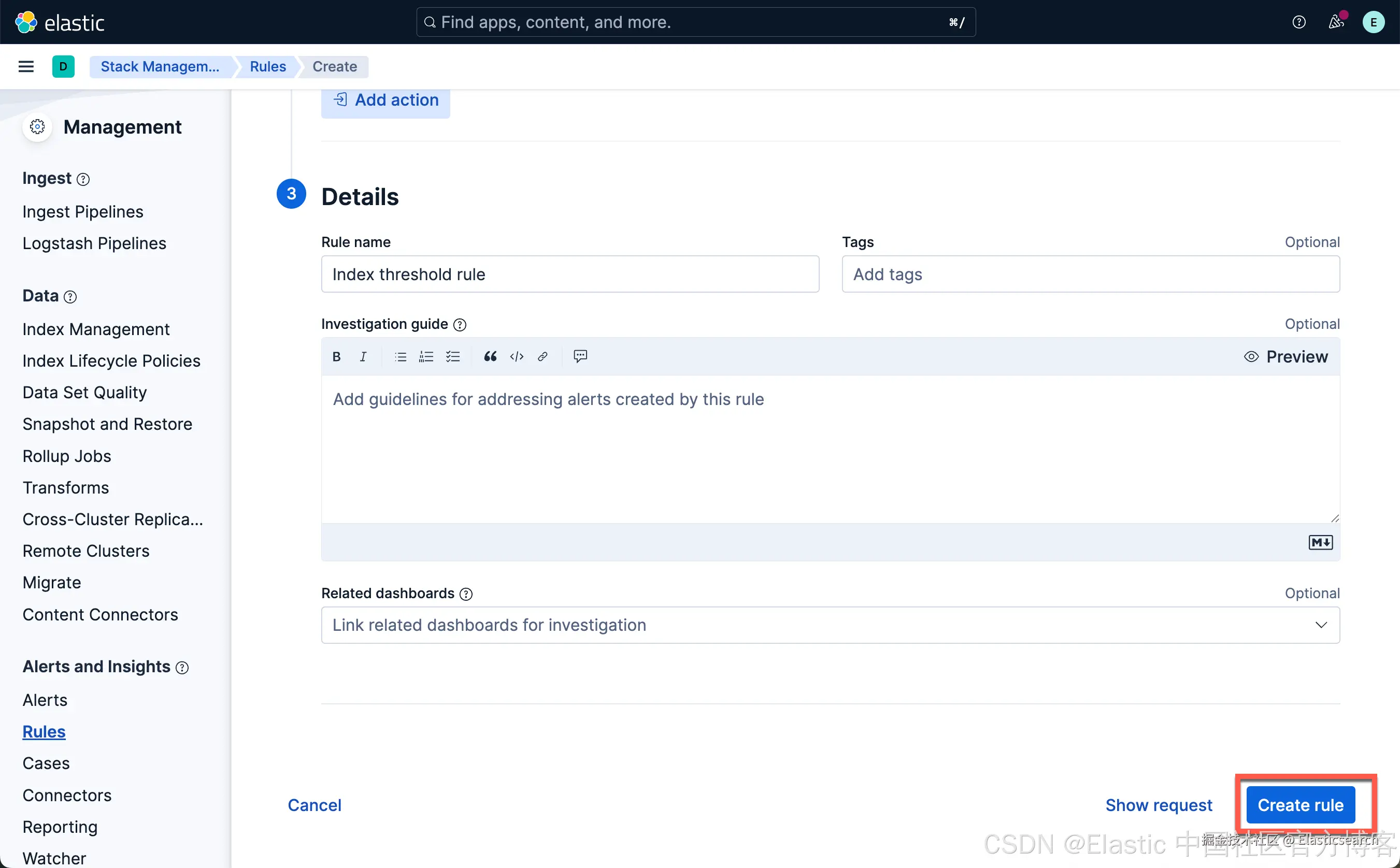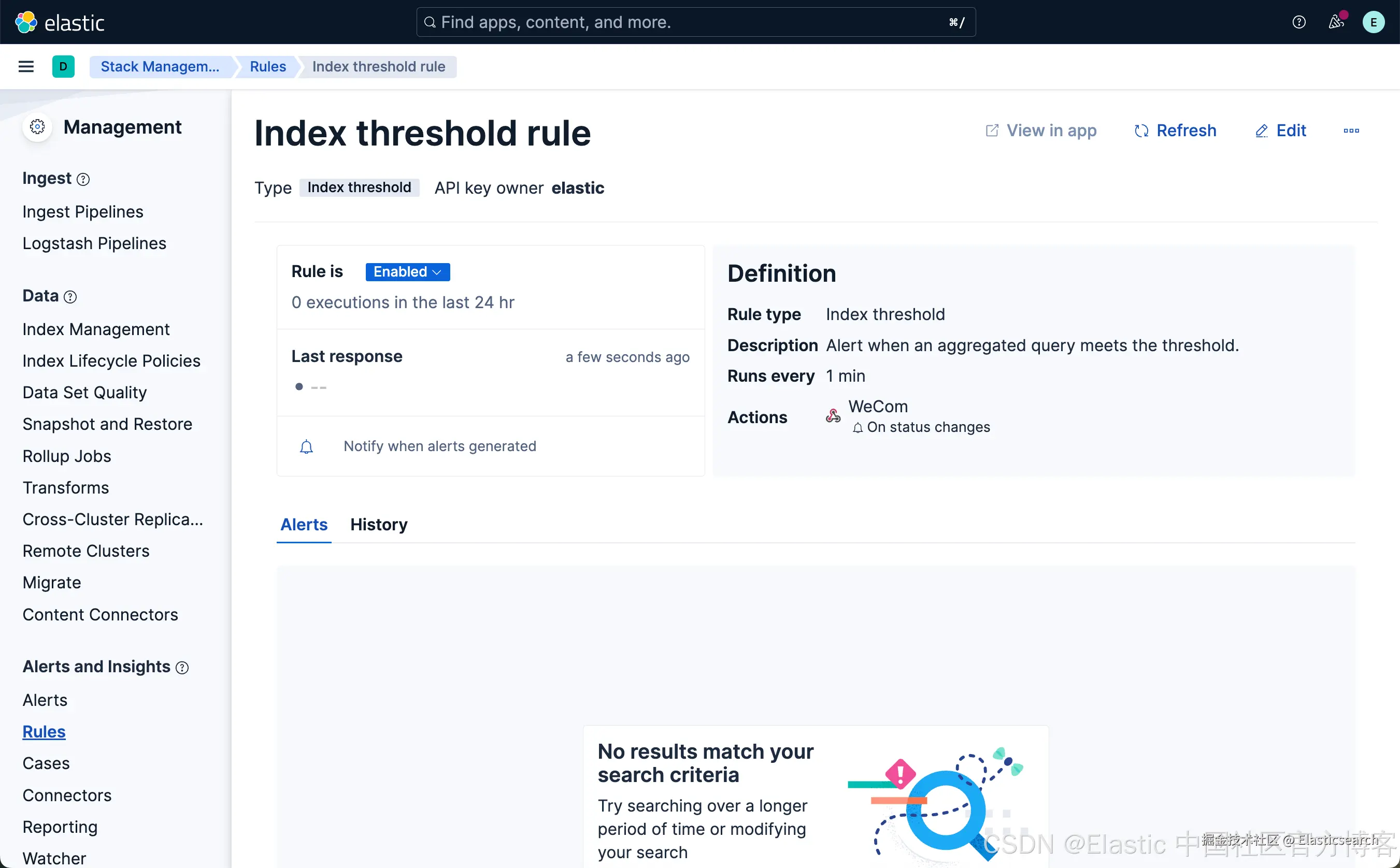 从上面显示中,我们可以看到已经创建了一个叫做 Index threshold rule 的规则。