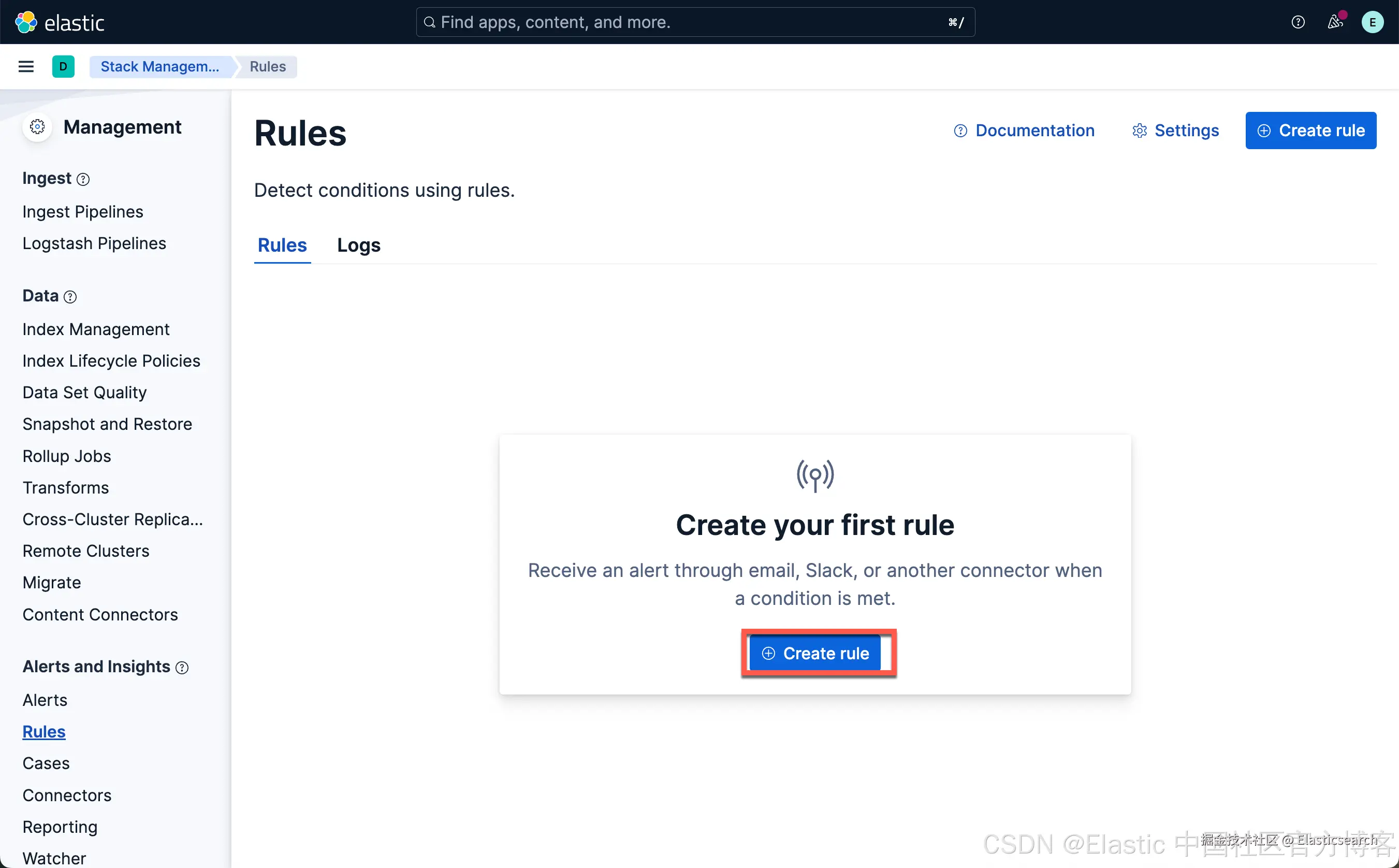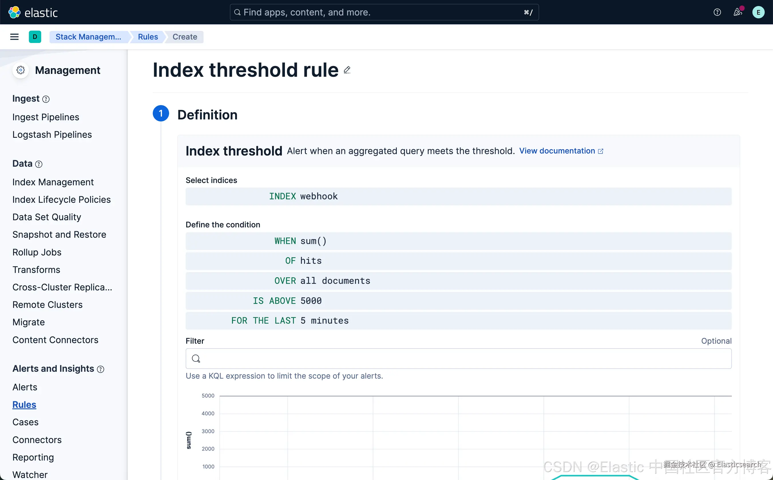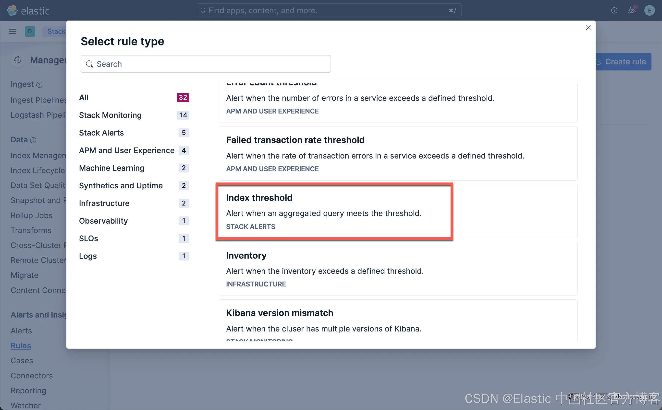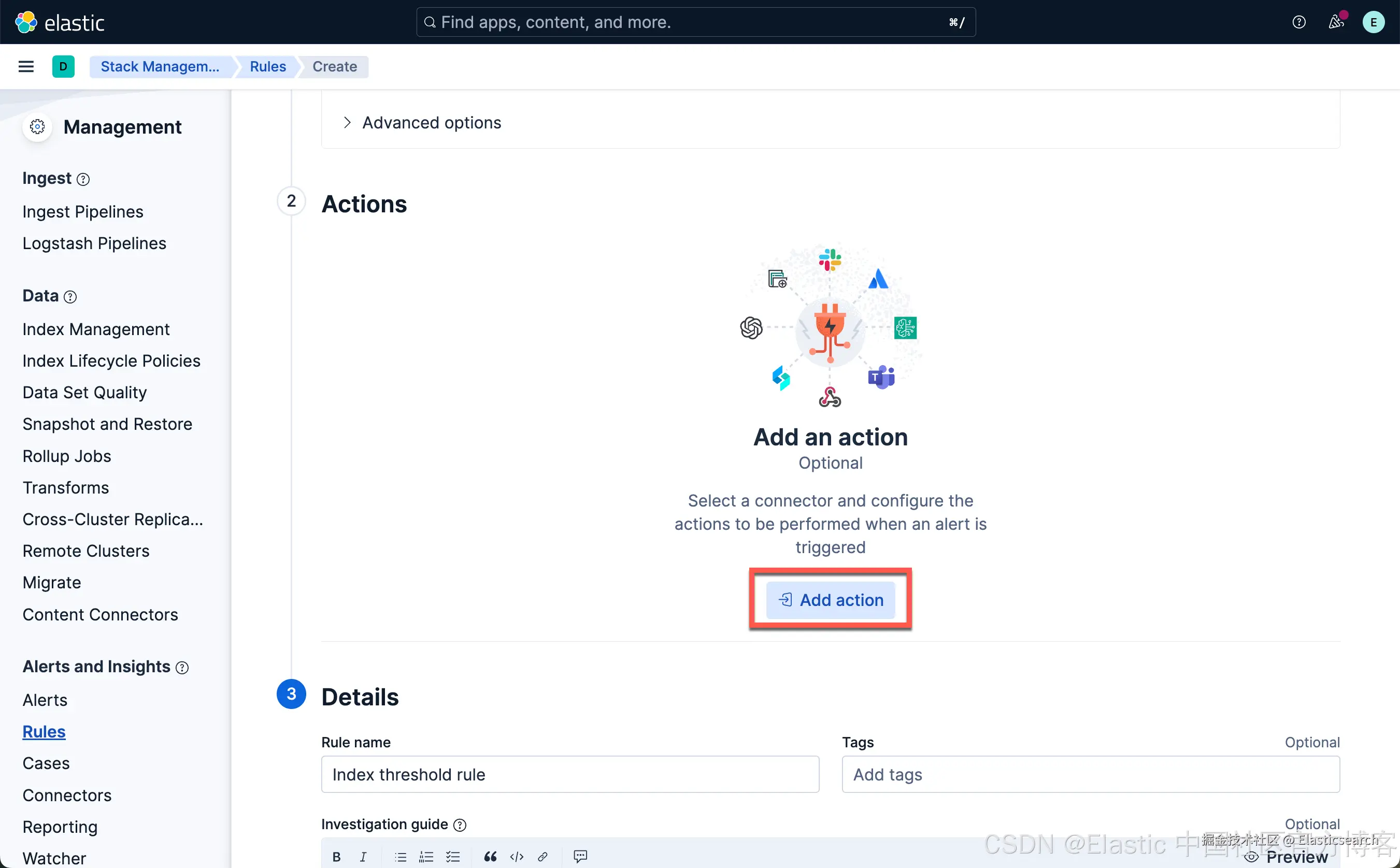 从上面显示中,我们可以看到已经创建了一个叫做 Index threshold rule 的规则。