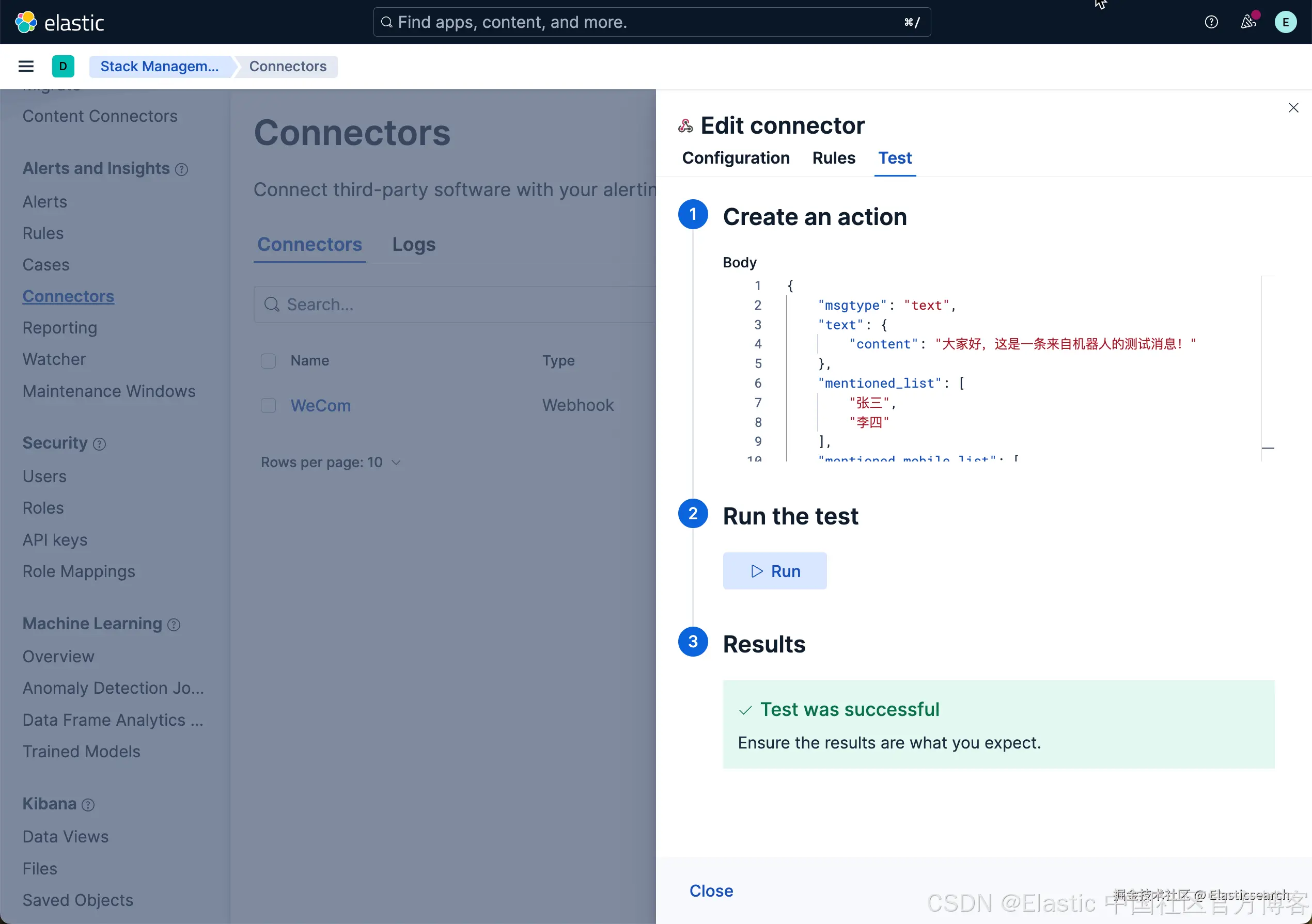 至此,我们已经展示了如何在 Kibana 中把通知发送到企业微信中。祝大家学习愉快!