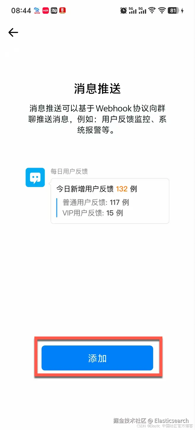 我们点击上面的 “添加” 来创建一个 Webhook 的消息推送: