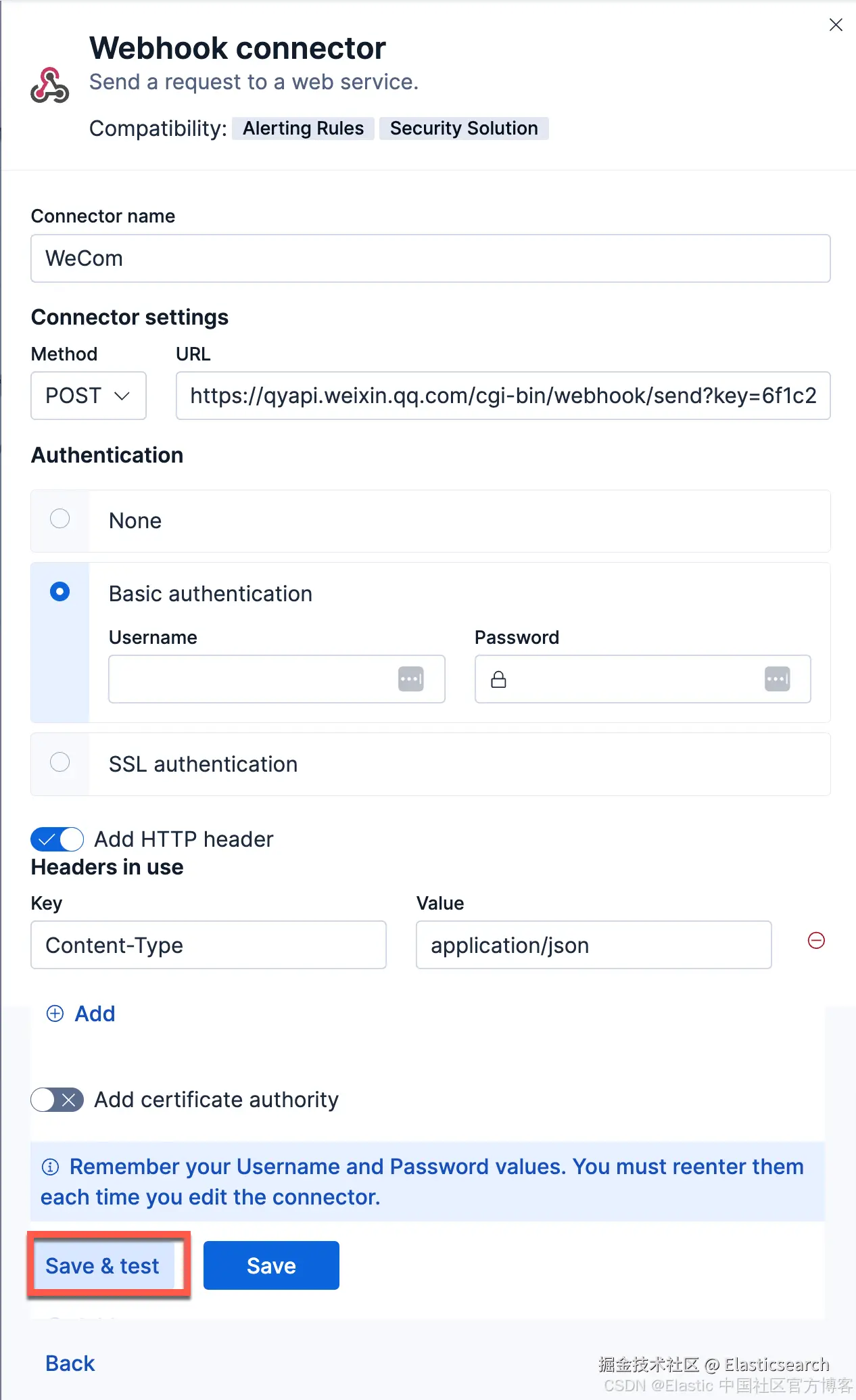 我们把所需要的信息填入进去。记得上面的 URL 就是之前我们创建的 URL。我们选择 Save & test 来进行测试:
