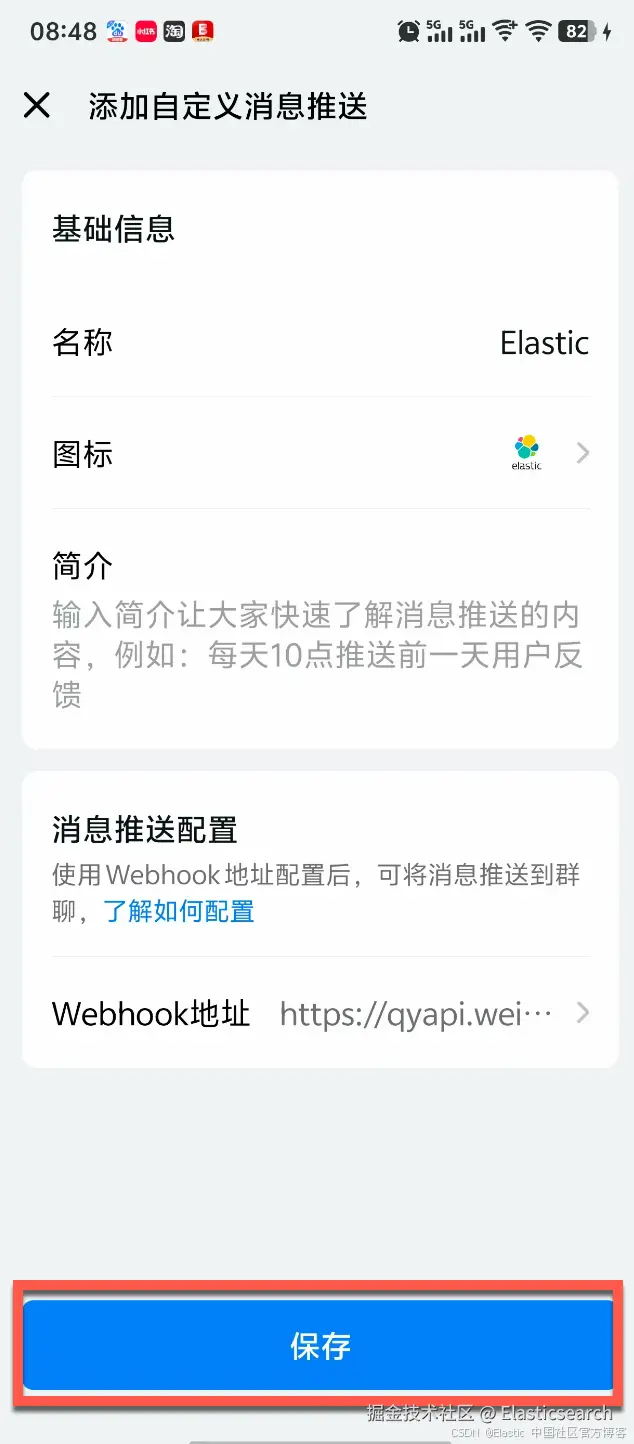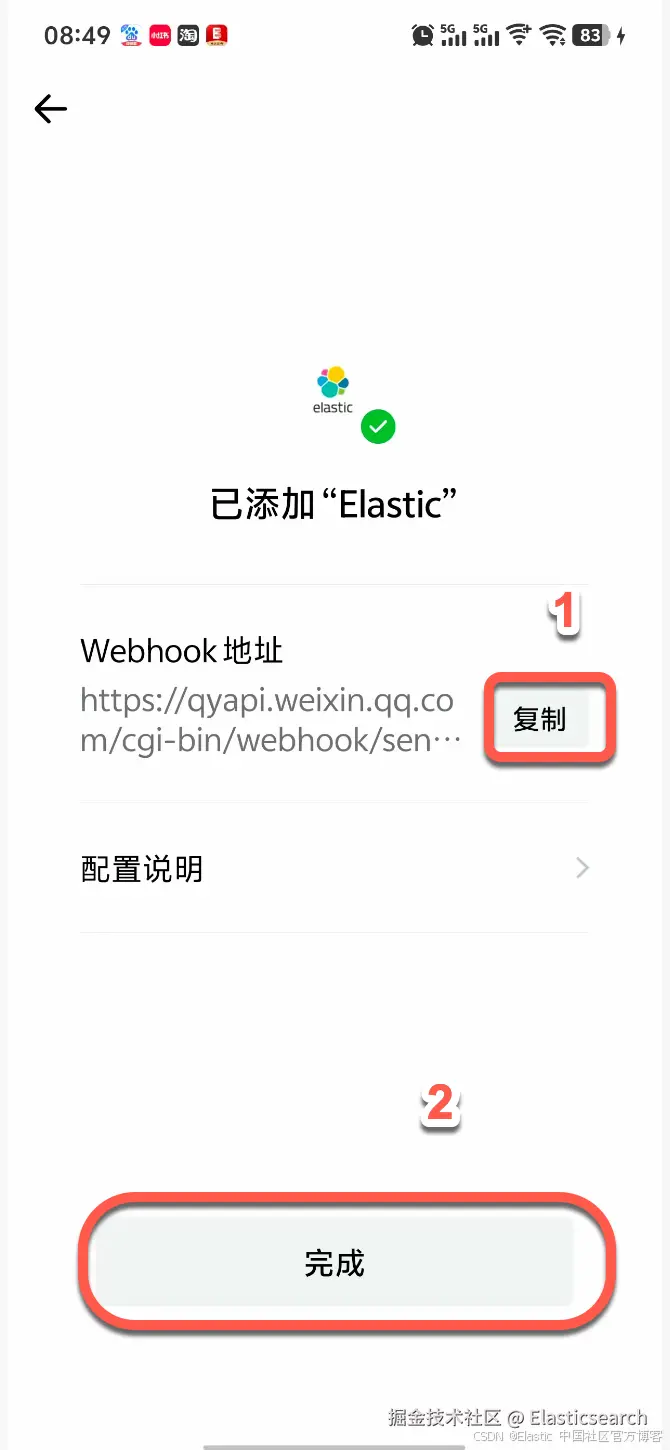 我们拷贝在上面图中显示的 Webhook 地址。在接下来的配置中,我们将对它进行使用。