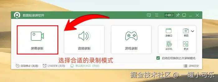 步骤1:在设备中搜索数据 蛙录屏软件并双击打开,程序主界面会呈现多种录制方案。推荐首次使用者选择 “屏幕录制” 模式。