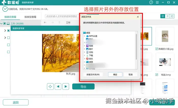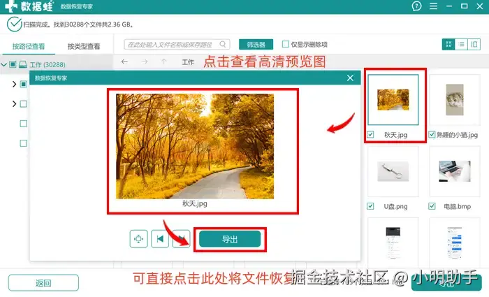步骤2:在扫描完成后,我们可以点击扫描出来的图片,查看大图确认内容。可直接点击“导出”,将照片恢复。
