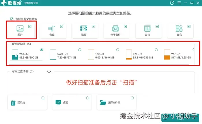 步骤1:在电脑(该软件兼容Windows和Mac电脑系统大部分版本)中顺利开启数据 蛙恢复专家后,进入扫描页面,页面上方安排为扫描数据的类型选择(除了照片对应的“图片”选项,还能够选择“文档”、“电子邮件”、“音频”、“视频”或“其他”) ,下方则是扫描位置的选择(支持外部,内部存储设备扫描) ,选好后点击“扫描”按钮。