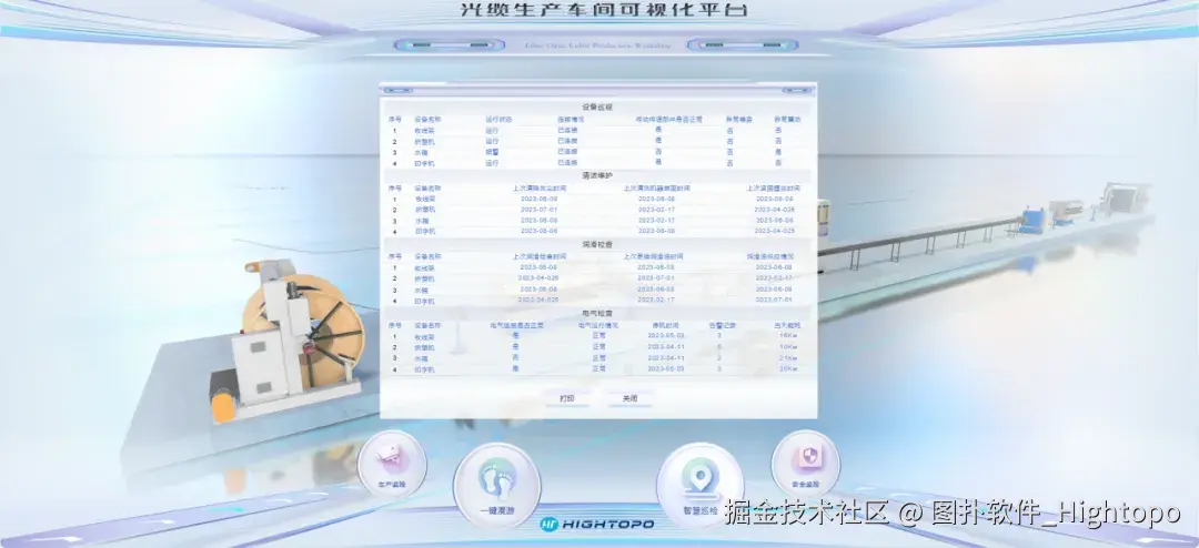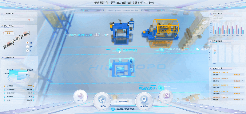 基于自研 HT for Web 构建的光缆生产车间轻量化监控系统,集控制、监视与管理功能于一体,可助力企业实现生产过程的数字化、智能化与自动化转型,显著提升效率、保障质量、创造价值。该系统可实时呈现工艺流程、设备运行状态、生产数据等关键信息。借助可视化大屏,管理者能直观掌握生产进度,快速定位潜a在问题并制定解决方案,有效提升生产效能。