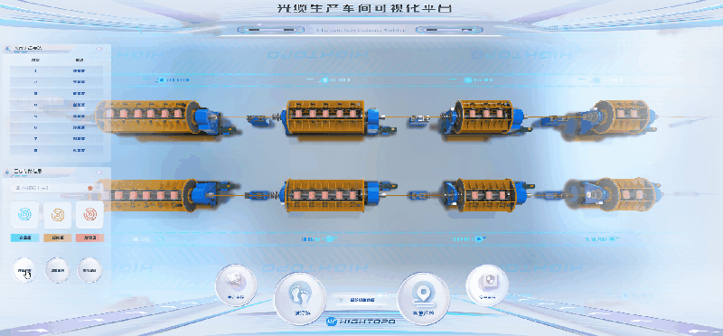 借助强大的自研渲染引擎,系统将车间生产运行动态以高保真 3D 模型进行还原。用户可远程遥控设备启停,清晰呈现以流程化、数字化方式组织的生产工序。光缆生产涵盖挤塑、绞线、交联、绕包、计米等多个环节: