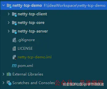 netty-tcp-core是公共模块,主要是工具类。netty-tcp-server是netty服务端,服务端仅作测试使用,实际项目中我们只使用了客户端。netty-tcp-client是客户端,也是本文的重点。