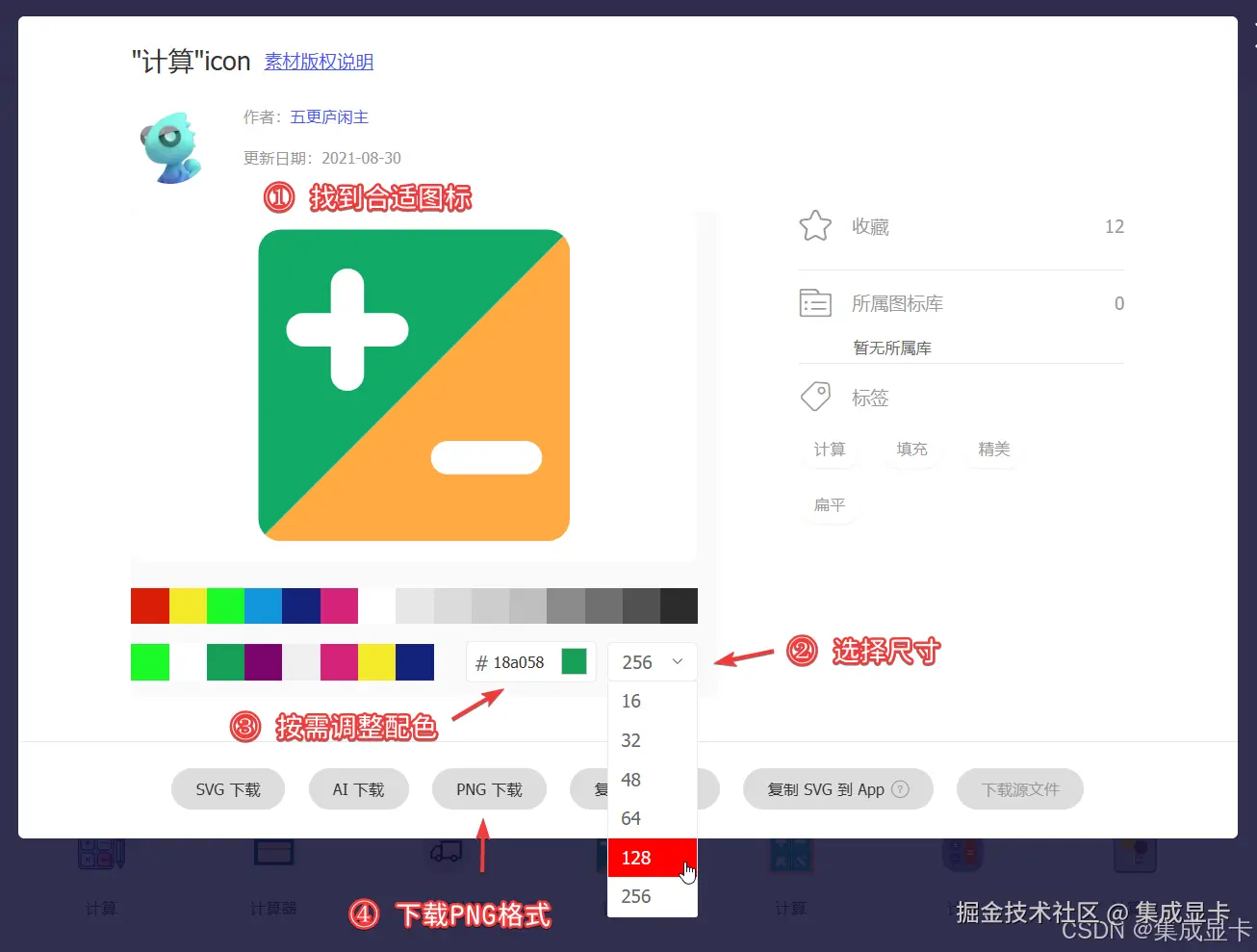 我的图标源自iconfont(关键词计算),可参考以下步骤下载不同尺寸的 PNG 图片。