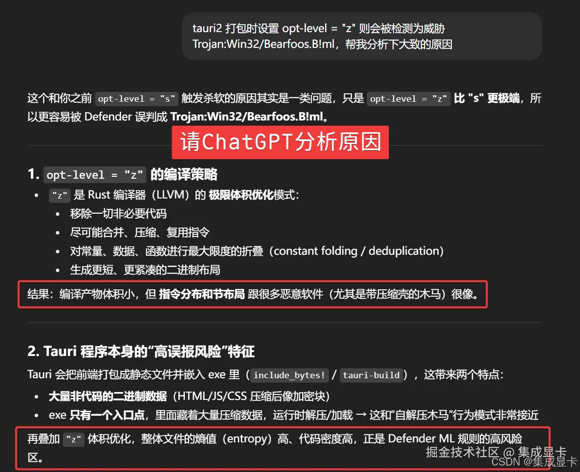 src-tauri\Cargo.toml 开启了opt-level = "z"极限压缩 exe 体积导致(个人主观判定),将配置换成s后,没有被拦截(此时体积增大 450KB 左右)。