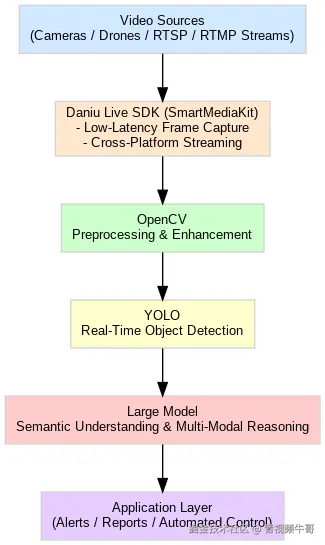 在一个实时视频智能分析系统中,大模型通常位于 YOLO 之后,负责高阶语义处理与业务决策: