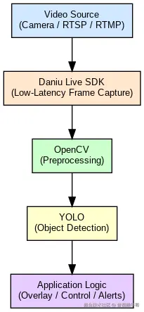 在实时视频智能分析中,YOLO 通常紧跟在大牛直播SDK的帧获取阶段之后:
