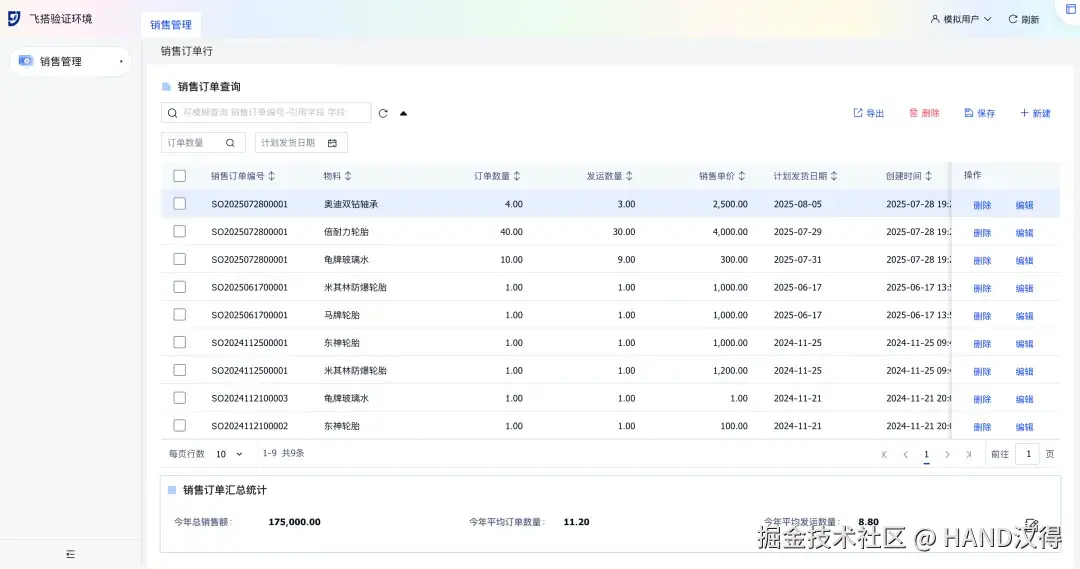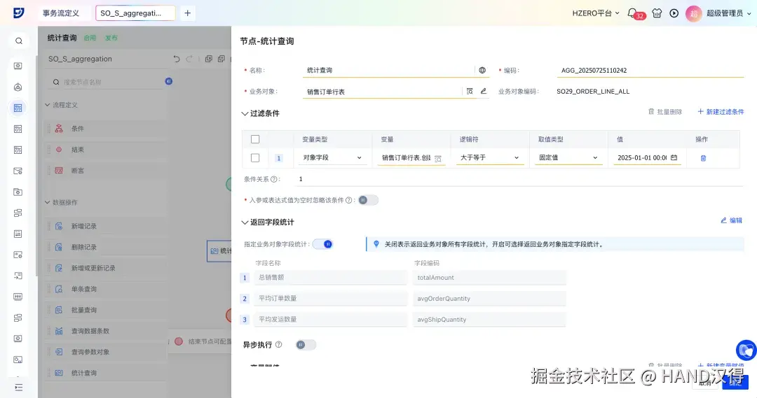 在销售管理场景中,为实现将字段统计在销售订单查询页面以表单形式展示,我们使用事务处理流的统计查询节点实现“总销售额”、“平均订单数量”与“平均发送数量”的查询;