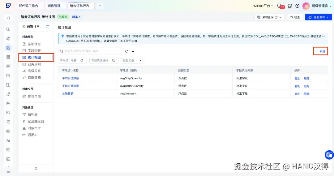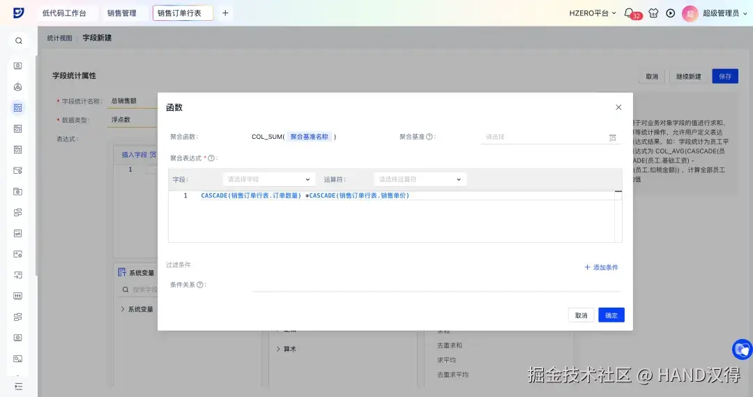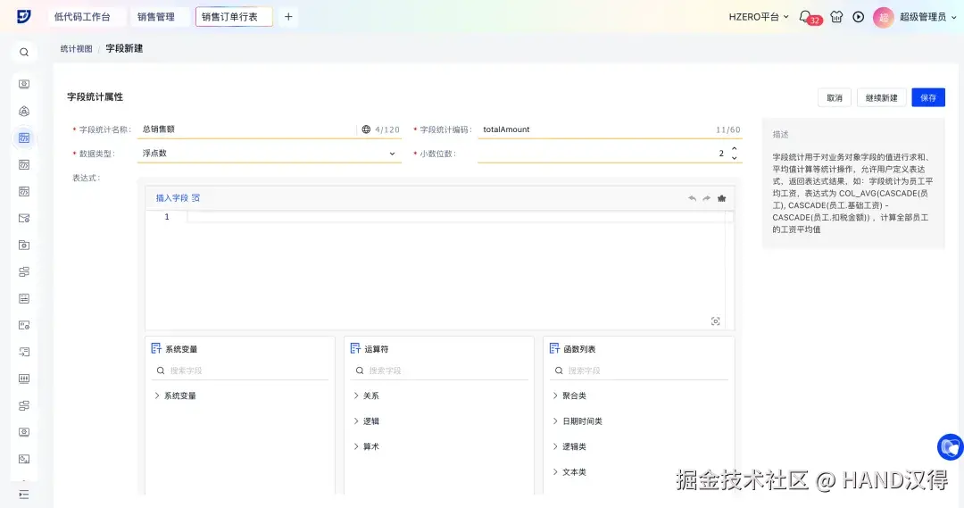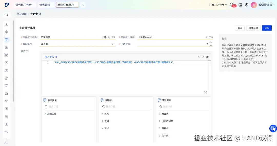 在销售管理场景中,以新建销售订单行对象的“总销售额”字段为例,介绍字段统计的配置步骤: