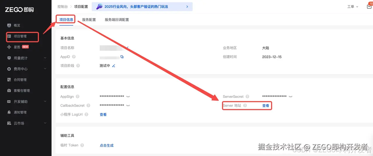 注意:Server 地址并非 ServerSecret,您可以参考下图在 ZEGO 控制台获取 Server 地址