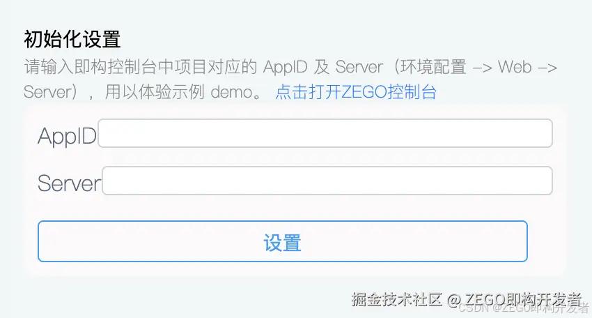 - 在下载的示例源码中,使用支持的浏览器,打开 “./src/Examples/DebugAndConfig/InitSettings/index.html” 文件,输入 前提条件 中获取的 AppID 和 Server 地址(不是 ServerSecret)后,单击“设置”。