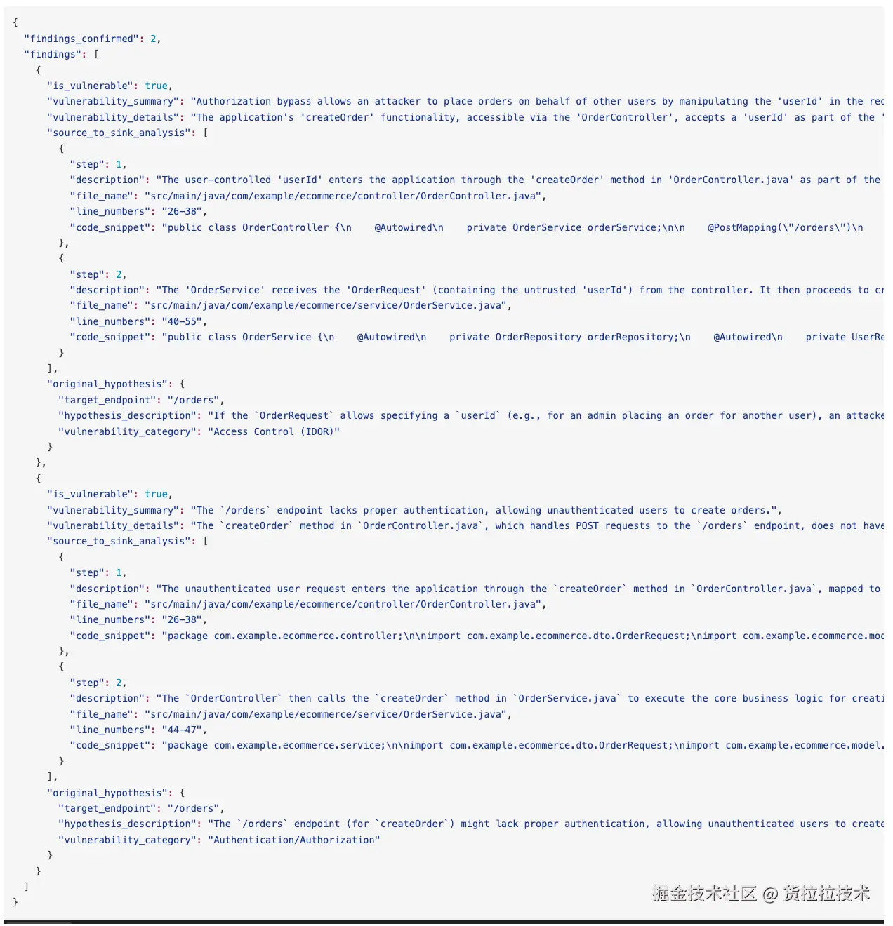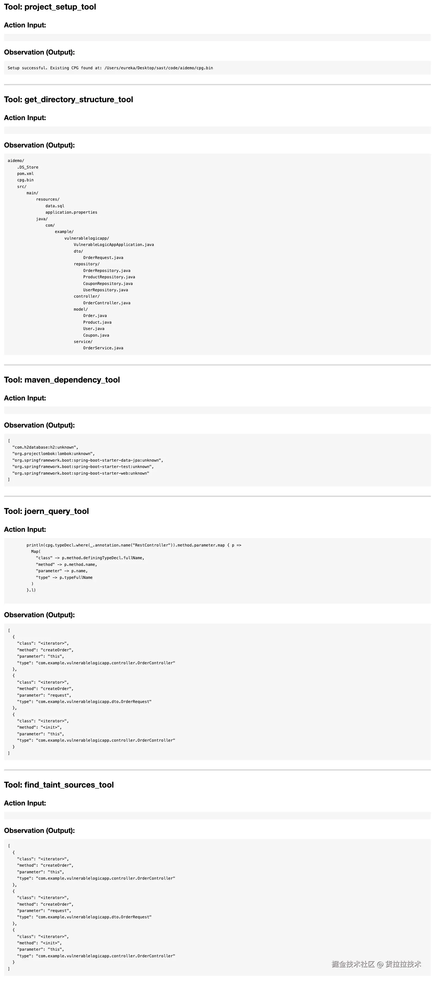 准确率 (Precision): 在发现的6个漏洞中,有5个经过人工验证为真实存在的有效漏洞,准确率达到83%。存在1例误报,主要原因是Agent在复杂的业务逻辑推演中,对一个净化函数的间接作用产生了误判。这得益于ReAct框架基于证据链的严谨验证过程,同时也指出了其在深度逻辑理解上的局限性。