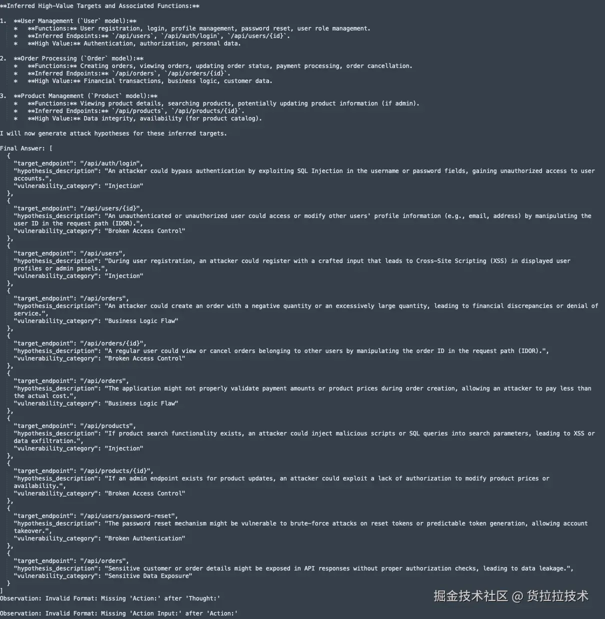 ⅱ. 生成攻击假设: Agent向LLM下达一个基于业务背景的指令,例如:“针对‘订单创建’流程,请提出几种最有可能的逻辑漏洞攻击假设。”