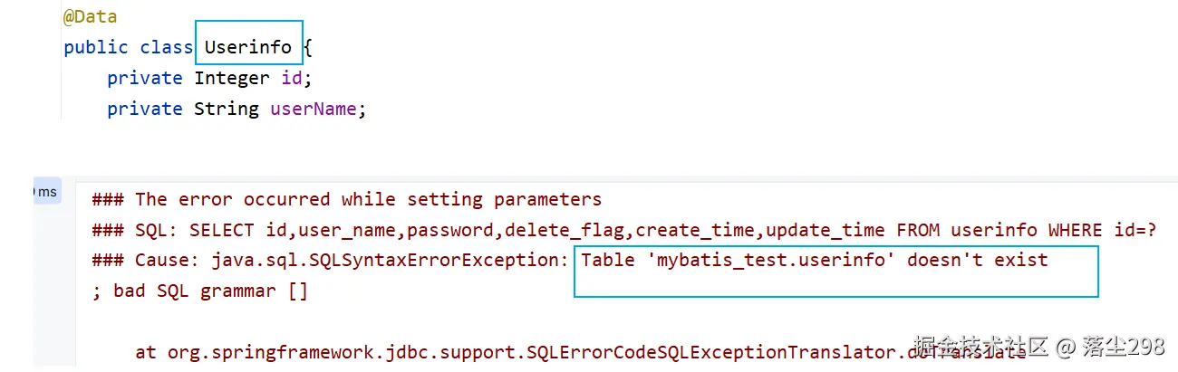 把类名修改以后就报错了,报错信息为数据库中找不到这个表,如果命名规范的话是可以把UserInfo转化为表名user_info的