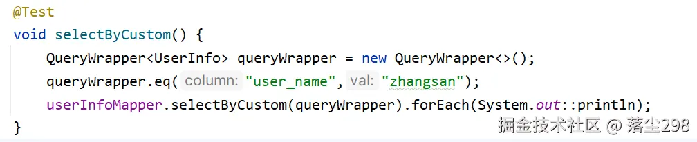 List<UserInfo> selectByCustom(@Param(Constants.WRAPPER) Wrapper<UserInfo> wrapper);