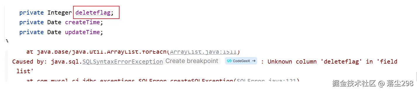 把规范的驼峰命名方式修改一下就又报错了,这时候,就要使用@TableField注解来指定对应的表的字段