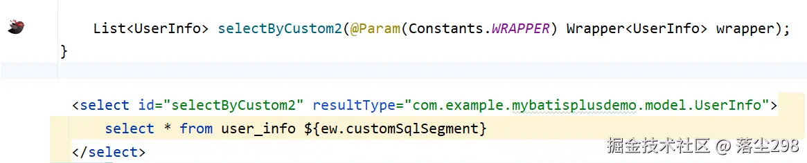 通过 ${ew.customSqlSegment} 引入了 Wrapper 对象生成的 SQL 片段,来实现自定义 sql,然后调用方法,传入一个 Wrapper 对象